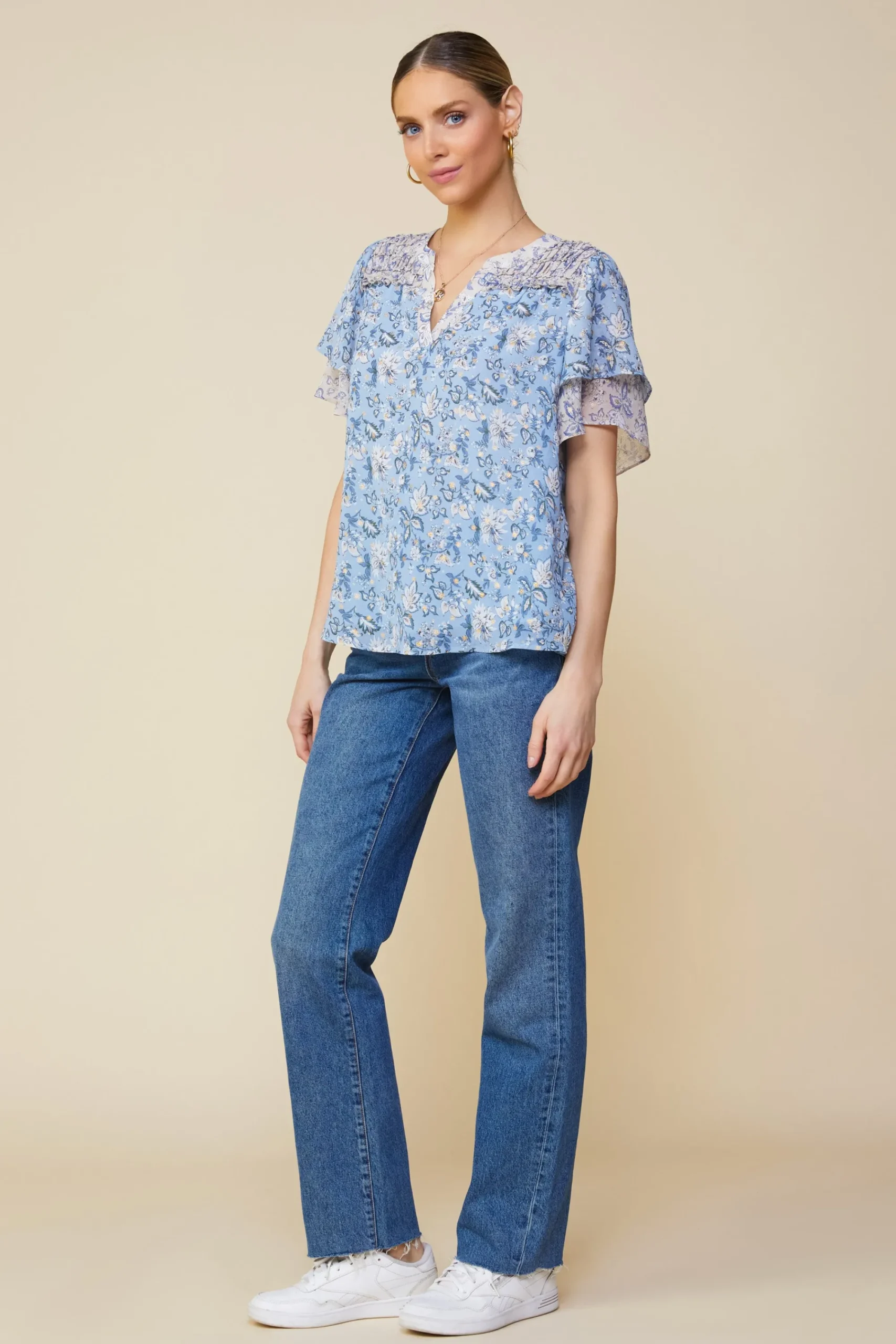 We love this print so much, we doubled it up with two colorways here: sky blue and pale grey. The top has even more to admire: gathered shoulder paneling, ruffle trim with picot stitching at the edges, and dual-layered short sleeves. So lovely.