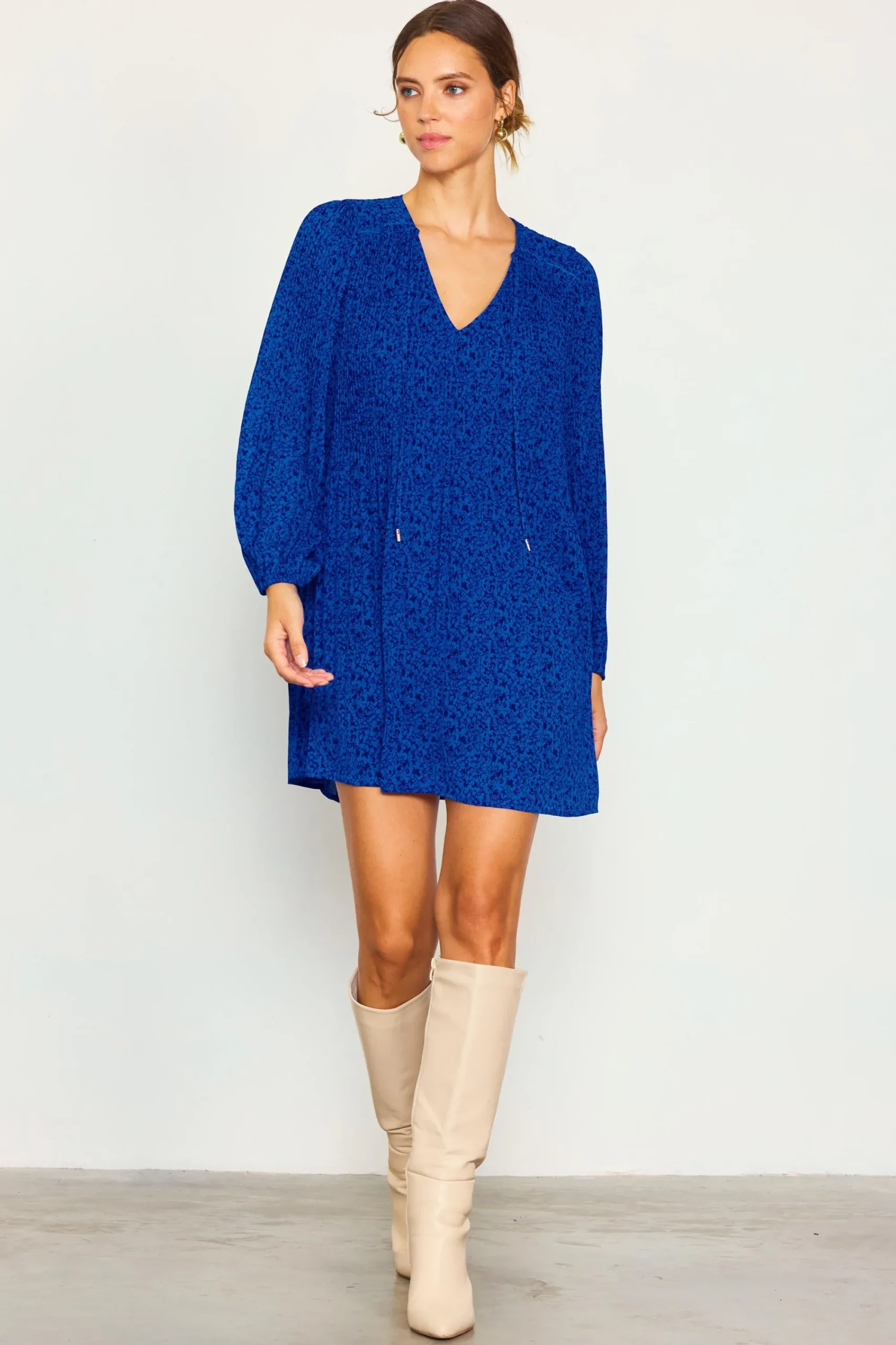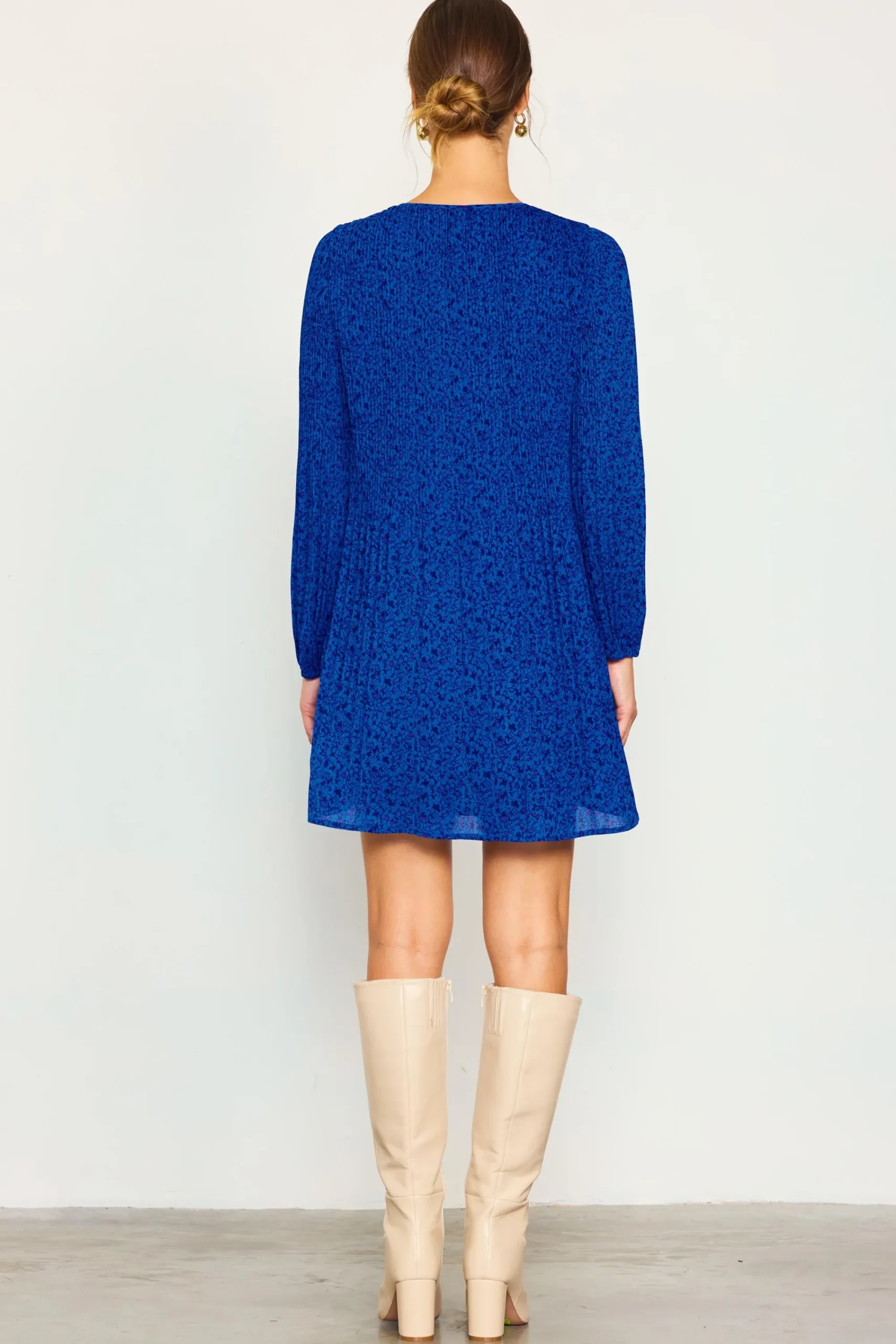 A cobalt-blue babydoll dress is breezy and charming in a dainty floral print. Done in a swingy silhouette with long sleeves, it’s got delicate micropleats and metal-tipped tie detailing at the neckline.