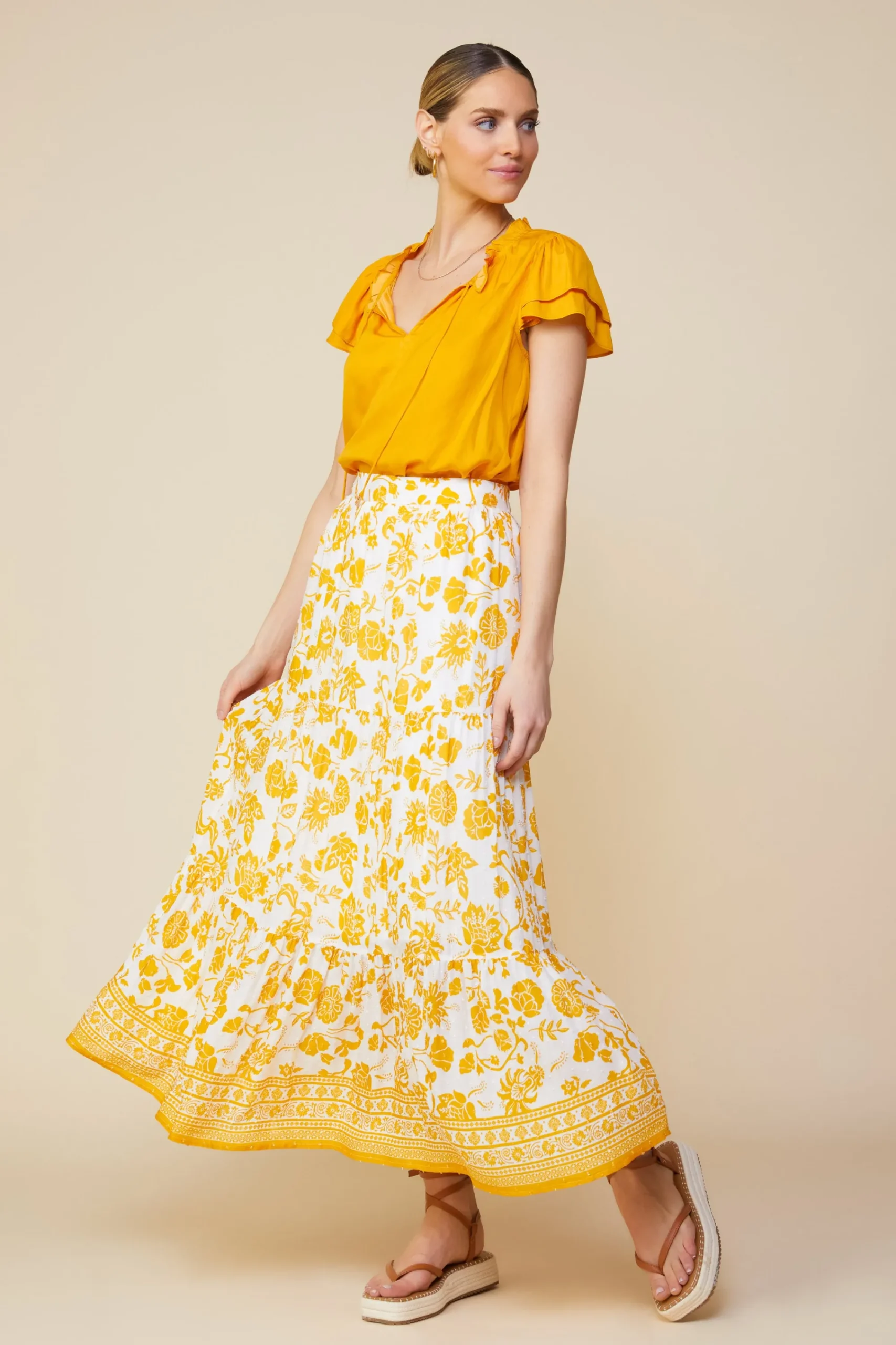 A bright and beachy midi skirt for basking in the golden days of the season. The tiered style is easy to slip on, and that marigold floral print is a total mood booster, adding a sunny vibe to the textured swiss dot fabric.