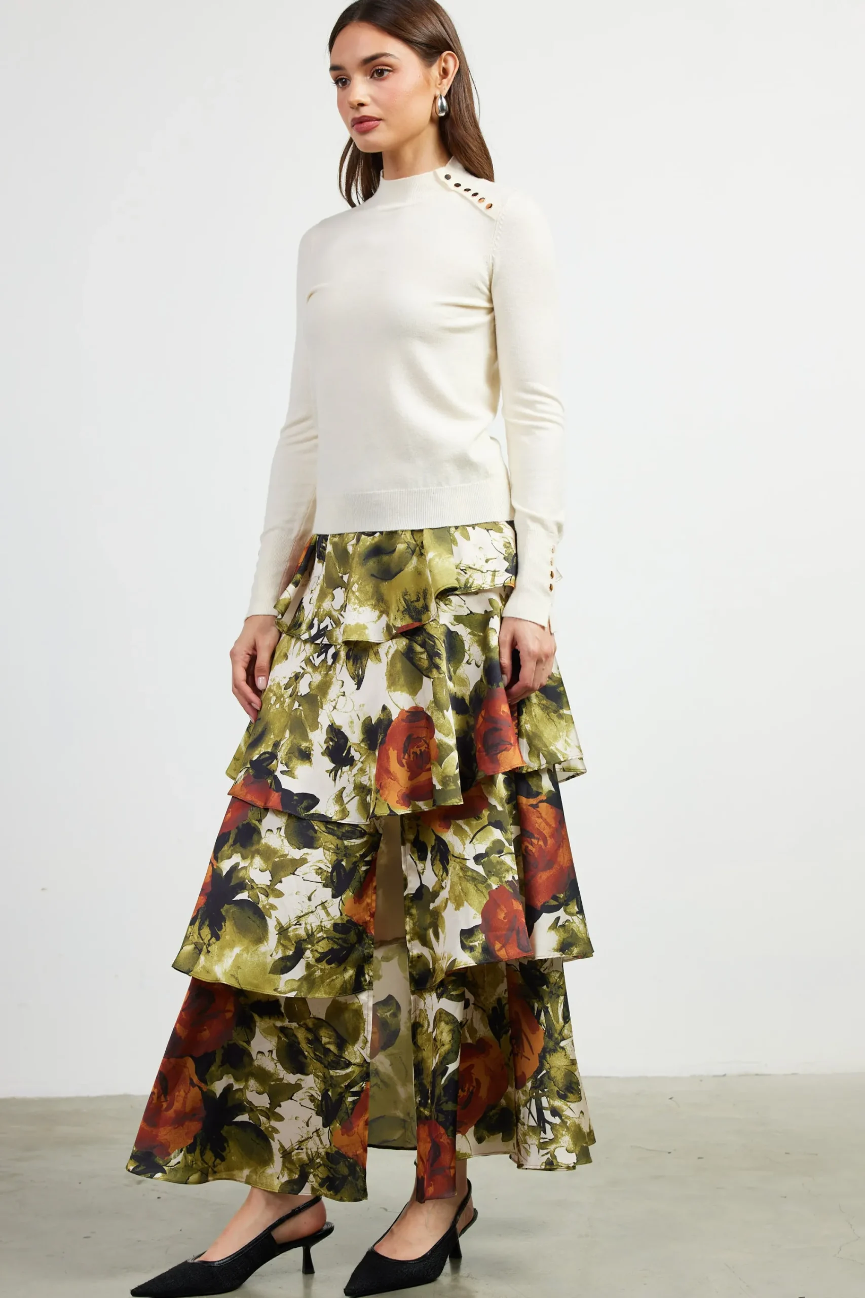 This mock-neck sweater exudes understated elegance in a soft, fine-gauge knit. Accented by shiny gold-tone hardware, the long-sleeve style features extended cuffs with a ribbed texture and split detailing.