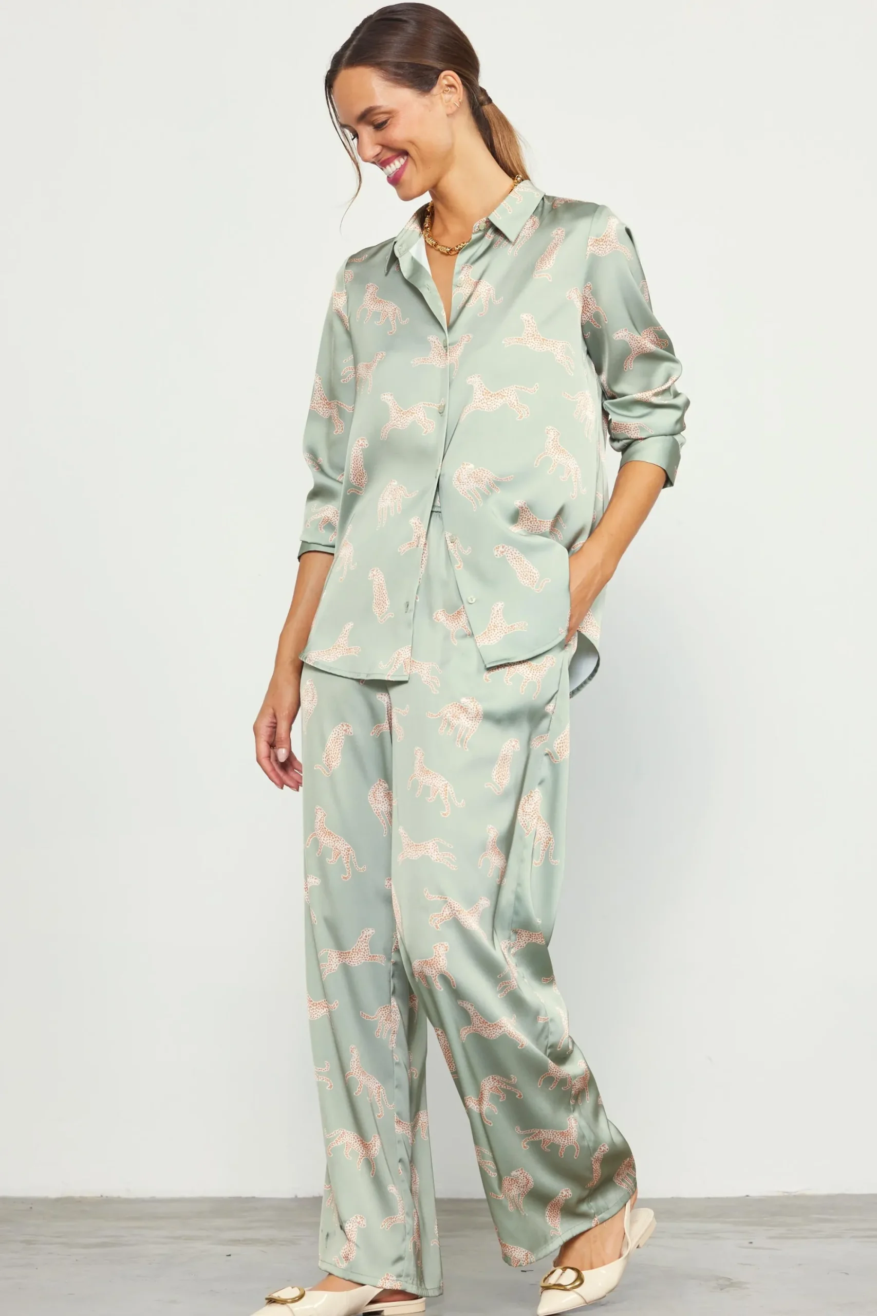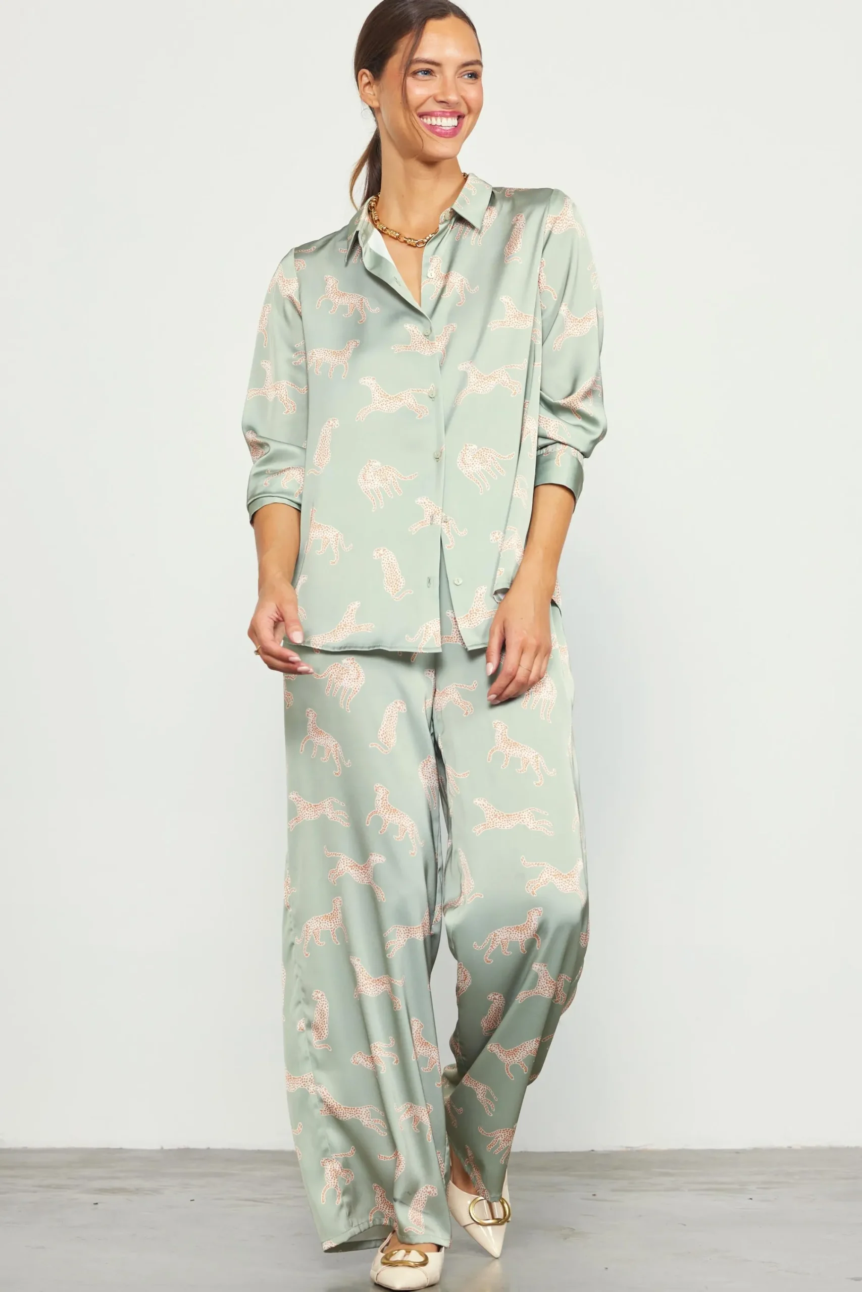 This satin buttondown shirt has a simple silhouette adorned with a playful cheetah print. Smooth and lustrous, this lightweight style features a pointed collar, long sleeves, and a relaxed fit.