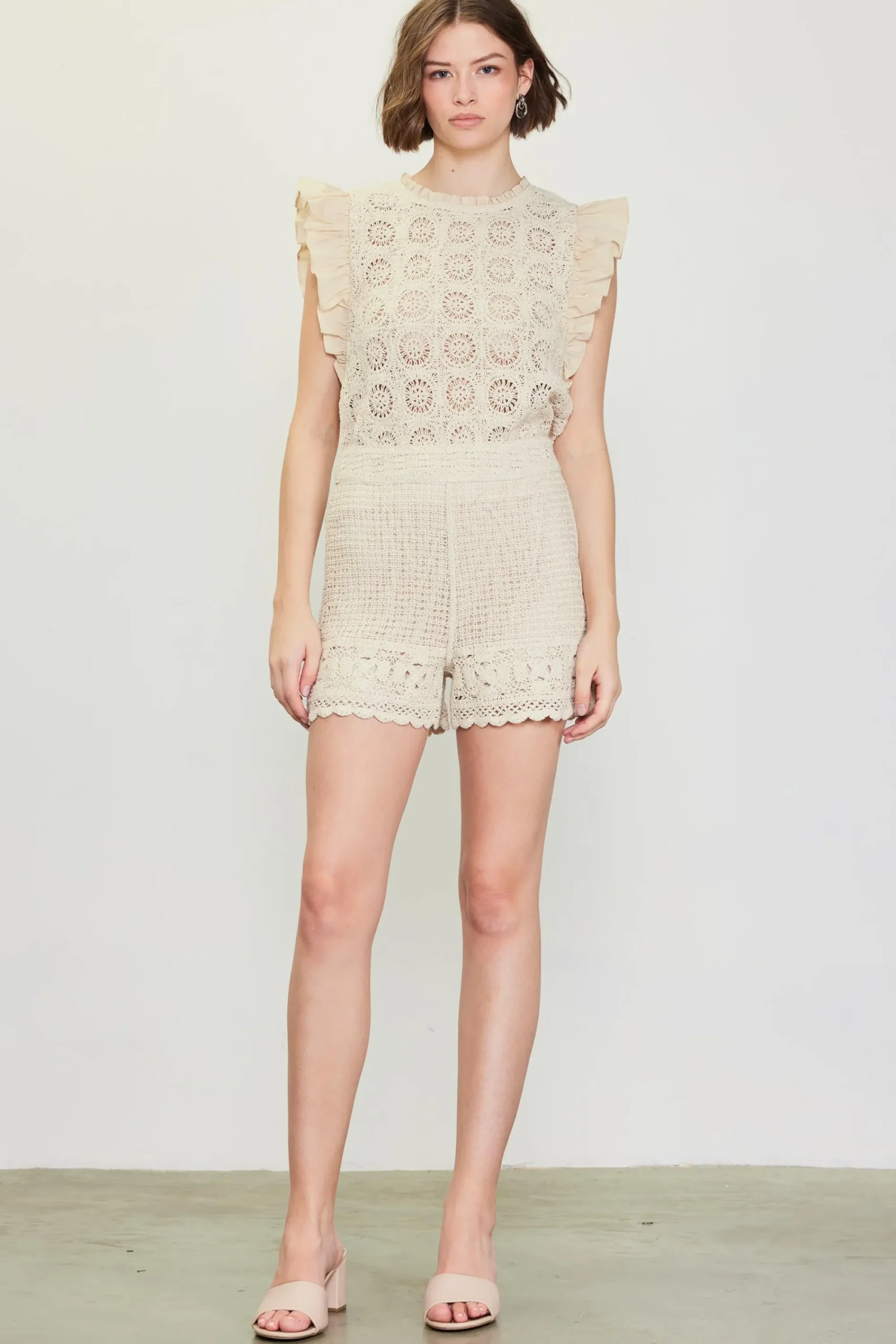 This crocheted top has a slightly boxy shape with lots of texture. Accented by woven trim, it has a ruffled neckline and flutter sleeves for a feminine flourish. A keyhole at the back completes the look.