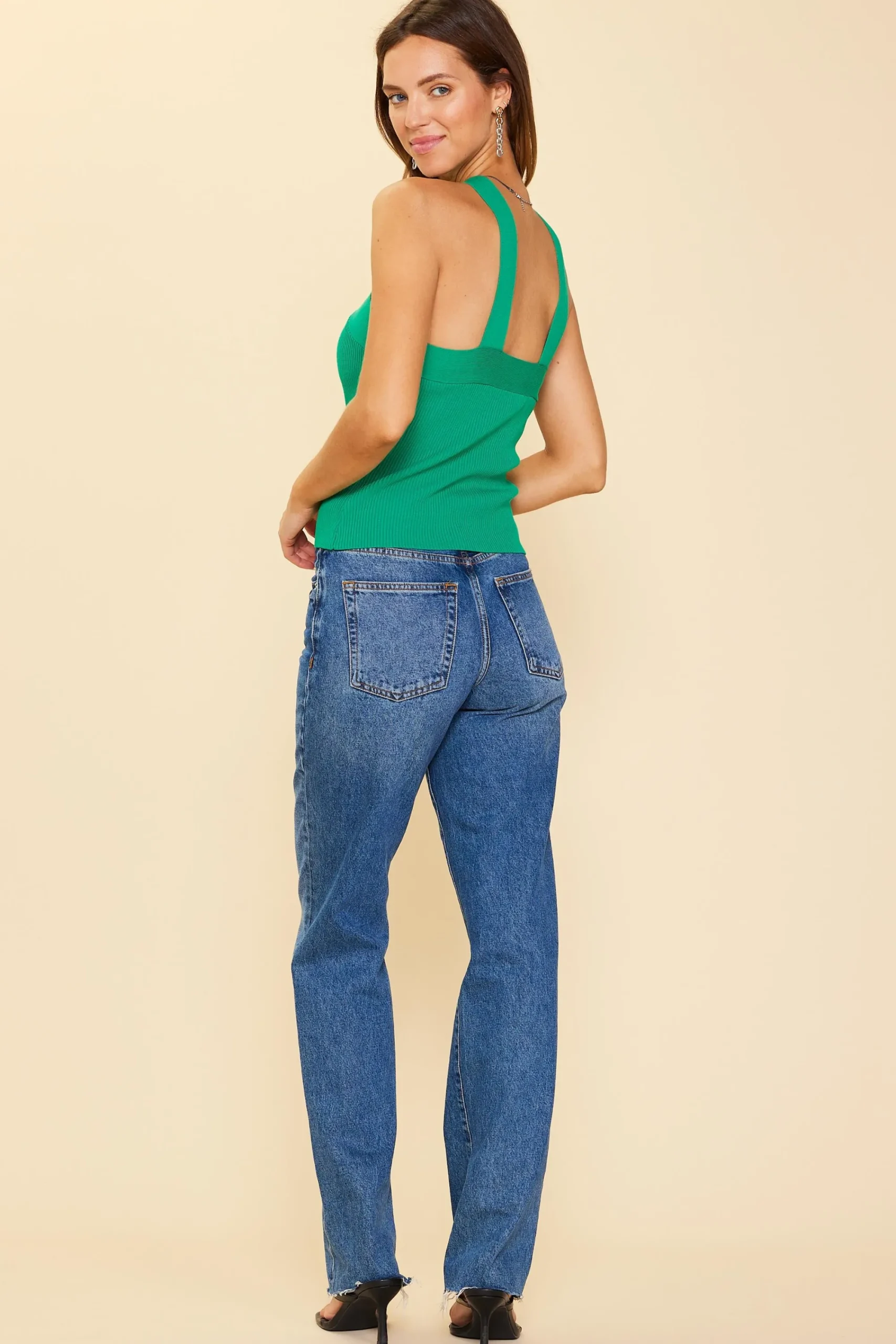 Designed in a figure-hugging rib knit, this sweater tank flatters with wide straps that crisscross the neckline. Clingy and comfortable, the textured top pairs well with high-rise denim, slinky skirts, wide-leg trousers—just about anything.