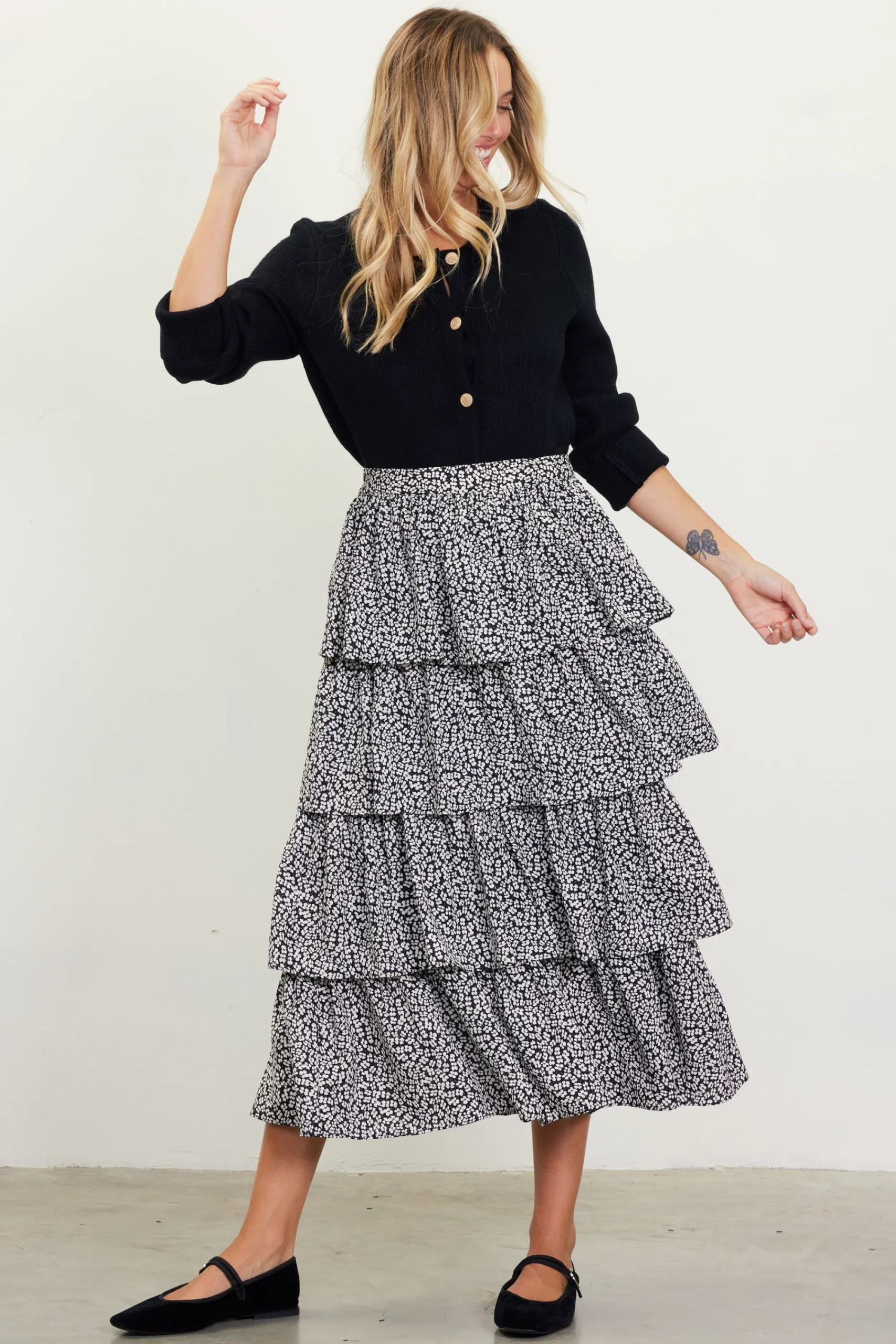 This floral-print midi skirt has tiers of ruffles that flutter with every step. Featuring dainty white blooms against a black base, it’s elasticized at the back waist for a secure and comfortable fit.