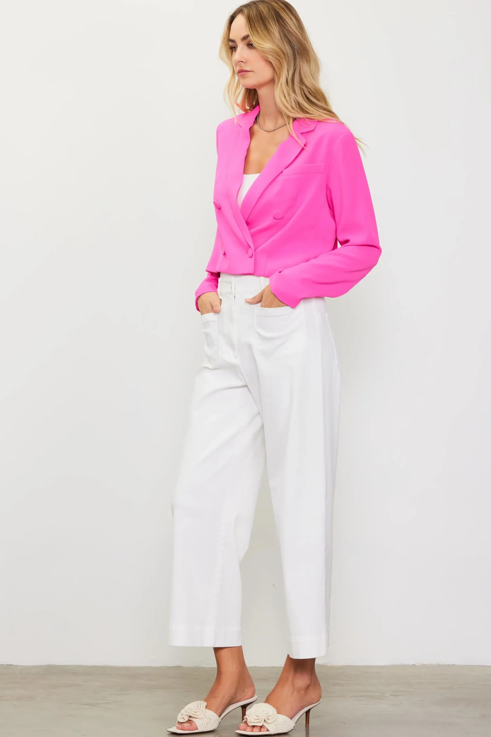 A double-breasted blazer elevates your ensembles with a tailored touch. It’s cropped and boxy, showcasing notched lapels, a single chest pocket, and covered buttons at the front. Add a matching pair of wide-leg pants for a look you can take to work or out to dinner.