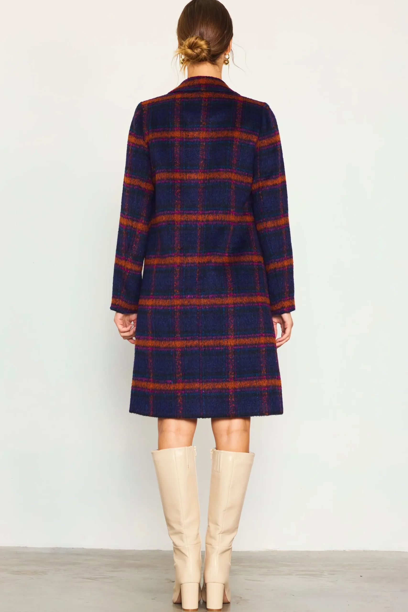 A long coat with double-breasted styling is classic, sophisticated, and wears well with everything—a true cold-weather staple. This version features a plaid motif in a soft, fuzzy texture.