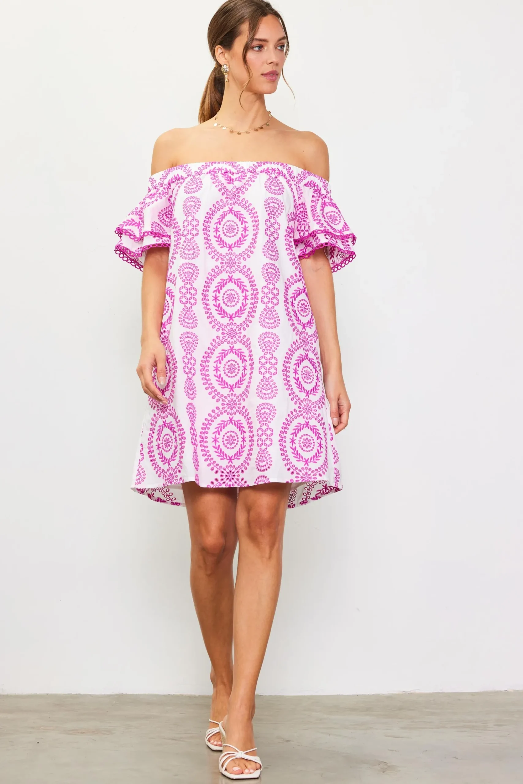 The perfect dress for sun seekers. This embroidered eyelet number has a relaxed, easy shape with tiered short sleeves and off-shoulder styling held in place by an elasticized neckline. Throw it on over your swimwear and add a pair of sandals.