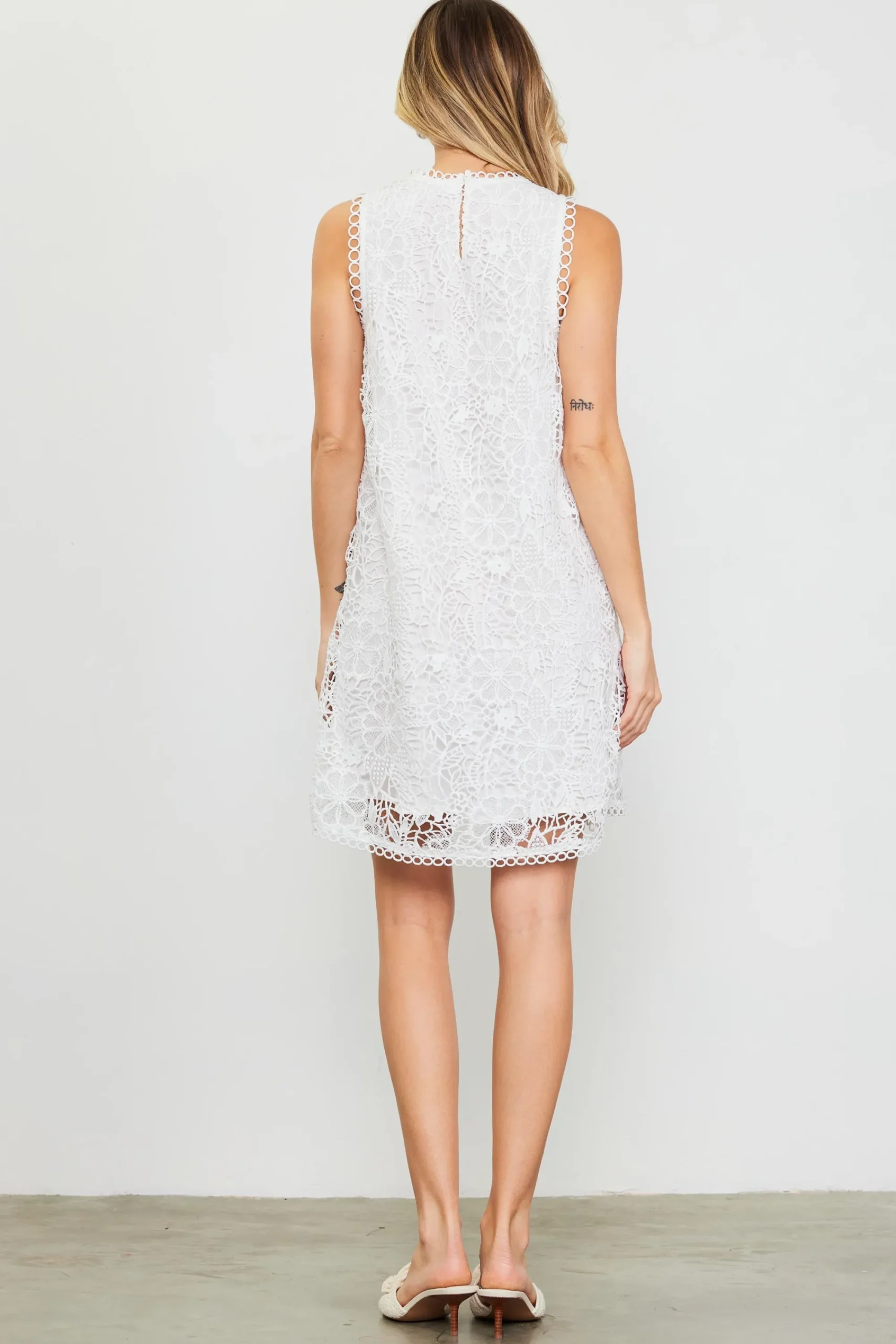 The perfect little white dress for the sunny season. Featuring a sleeveless silhouette and a round neckline, it’s dreamed up in off-white embroidered lace with a floral motif and layered over a tonal base. Open eyelet trim and a back keyhole complete the look.