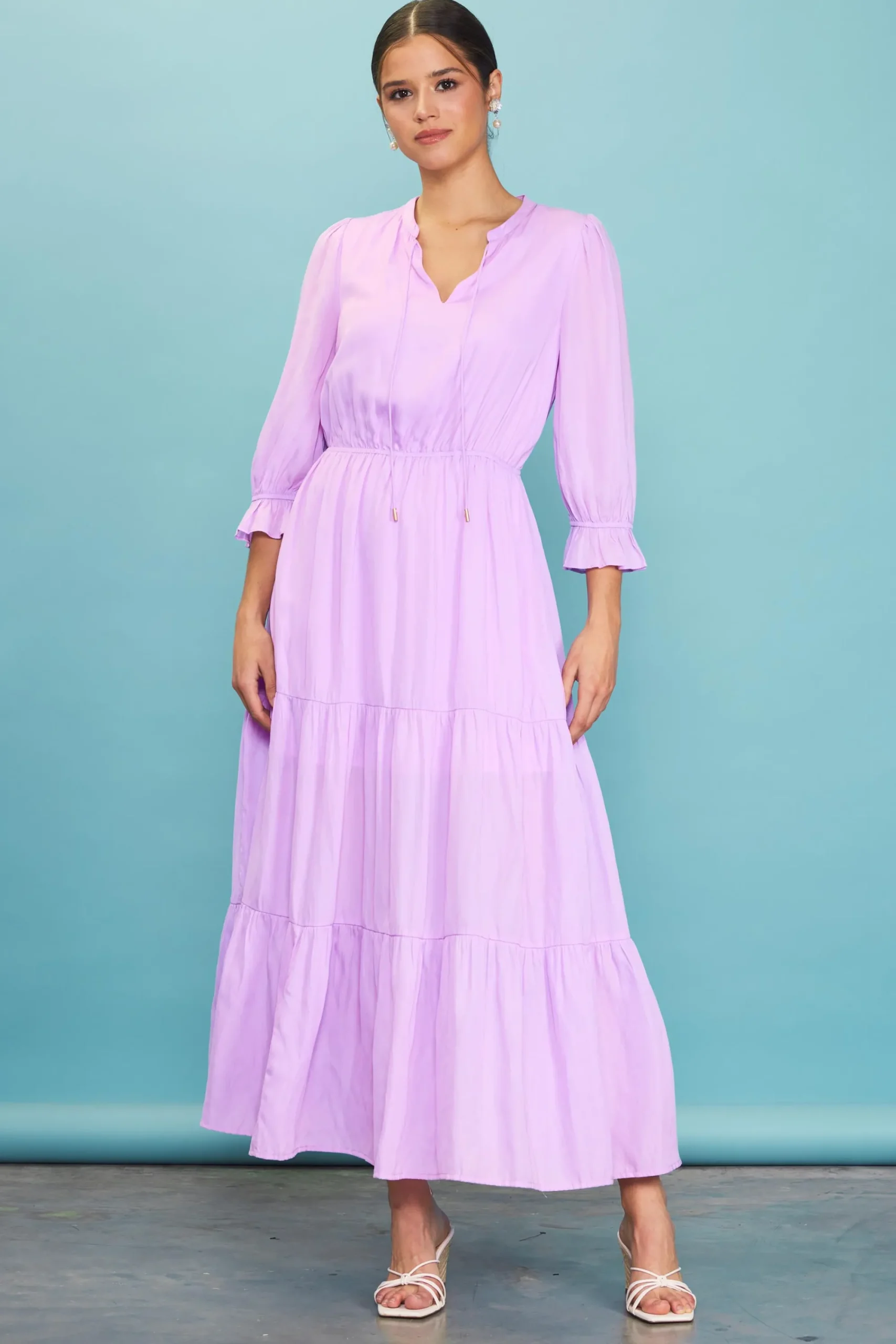 This breezy maxi dress has an effortlessly feminine feel in a long, flowy silhouette. It’s a long-time favorite, designed with a split neckline, three-quarter sleeves, and a ruffled tiered skirt.