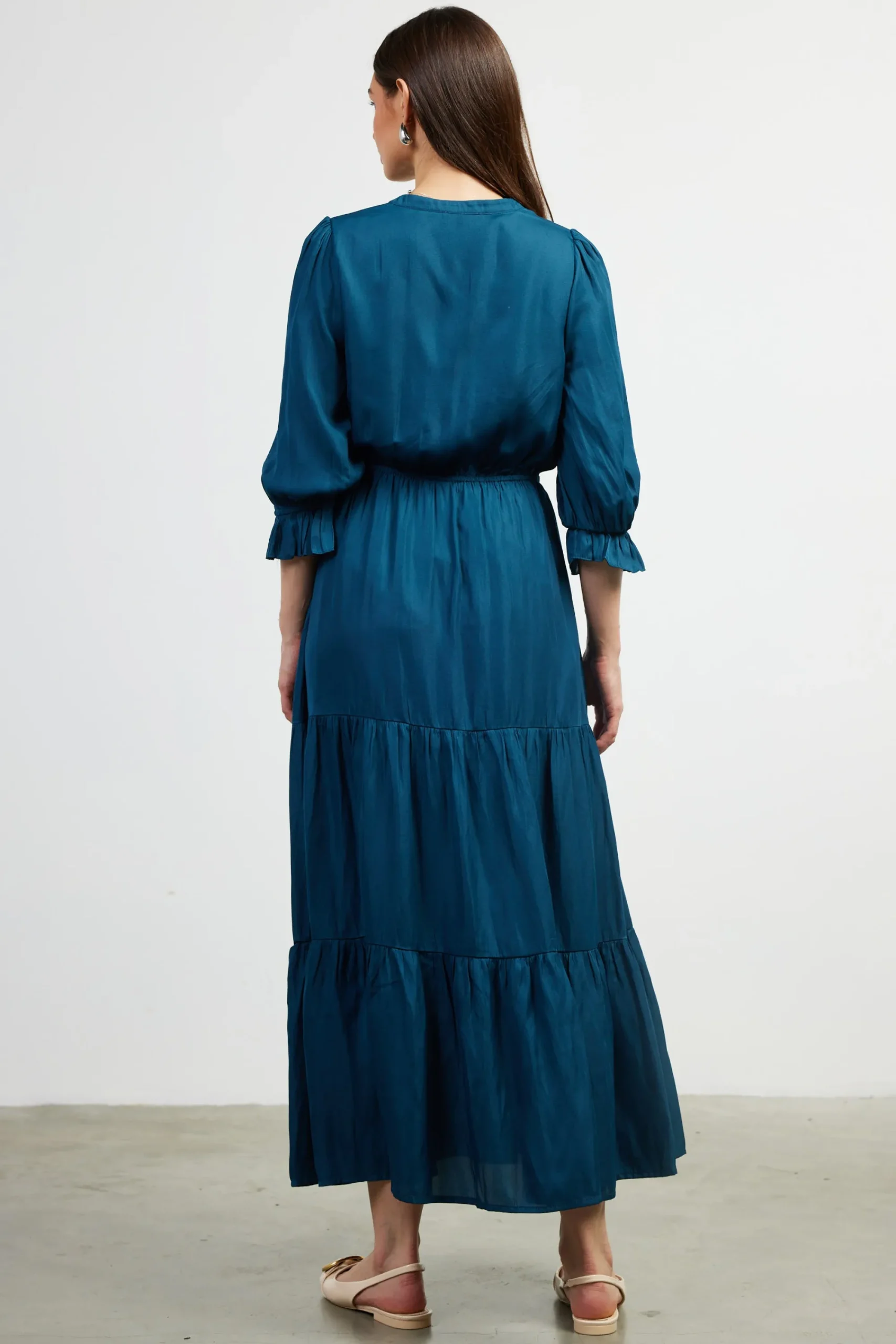 Romance is in the air. Get ready to fall in love with this maxi dress featuring a split neckline, three-quarter sleeves, and a ruffled tiered skirt.