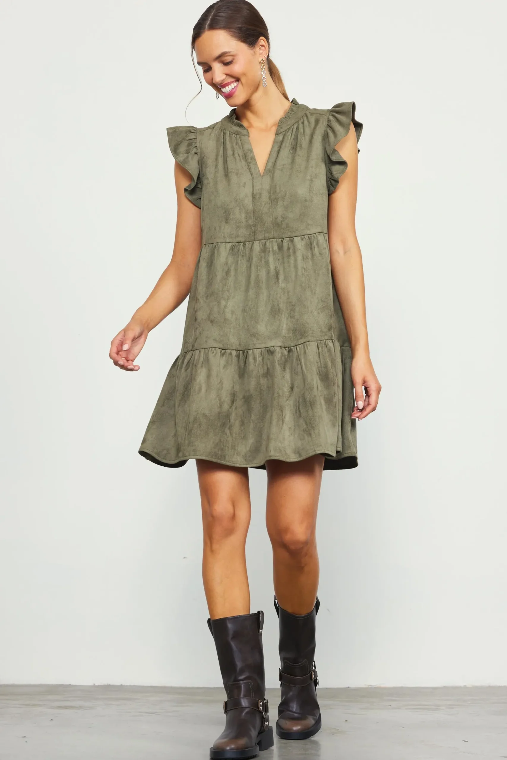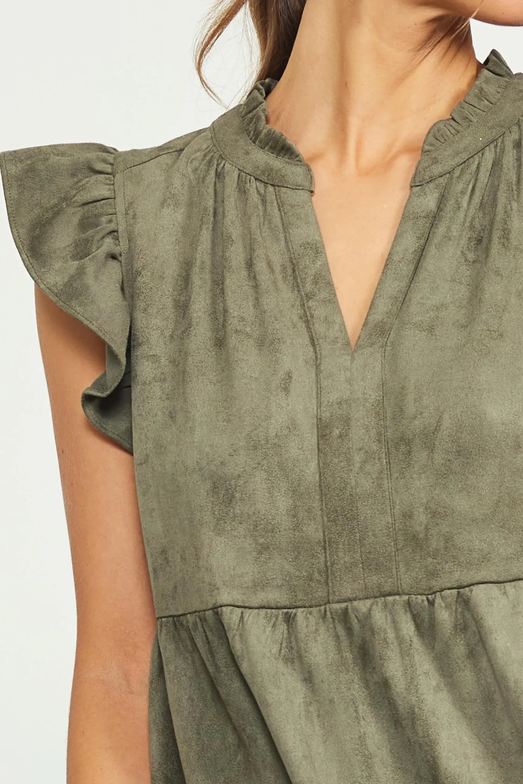 Soft to the touch in faux suede, this tiered mini dress has a relaxed silhouette with lots of movement. The details are so feminine: a split neckline with ruffle trim, fluttery sleeves, and gentle gathers throughout.