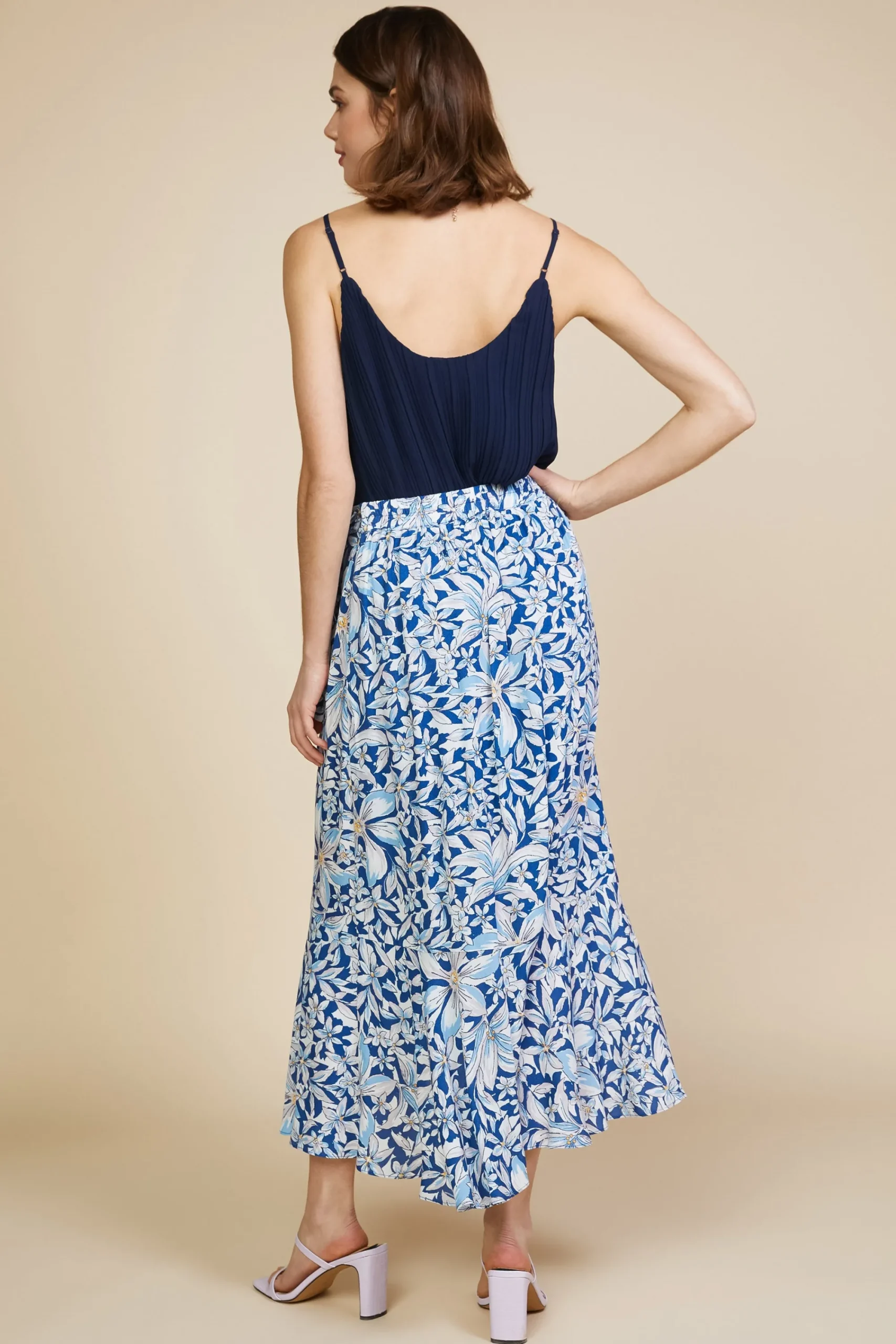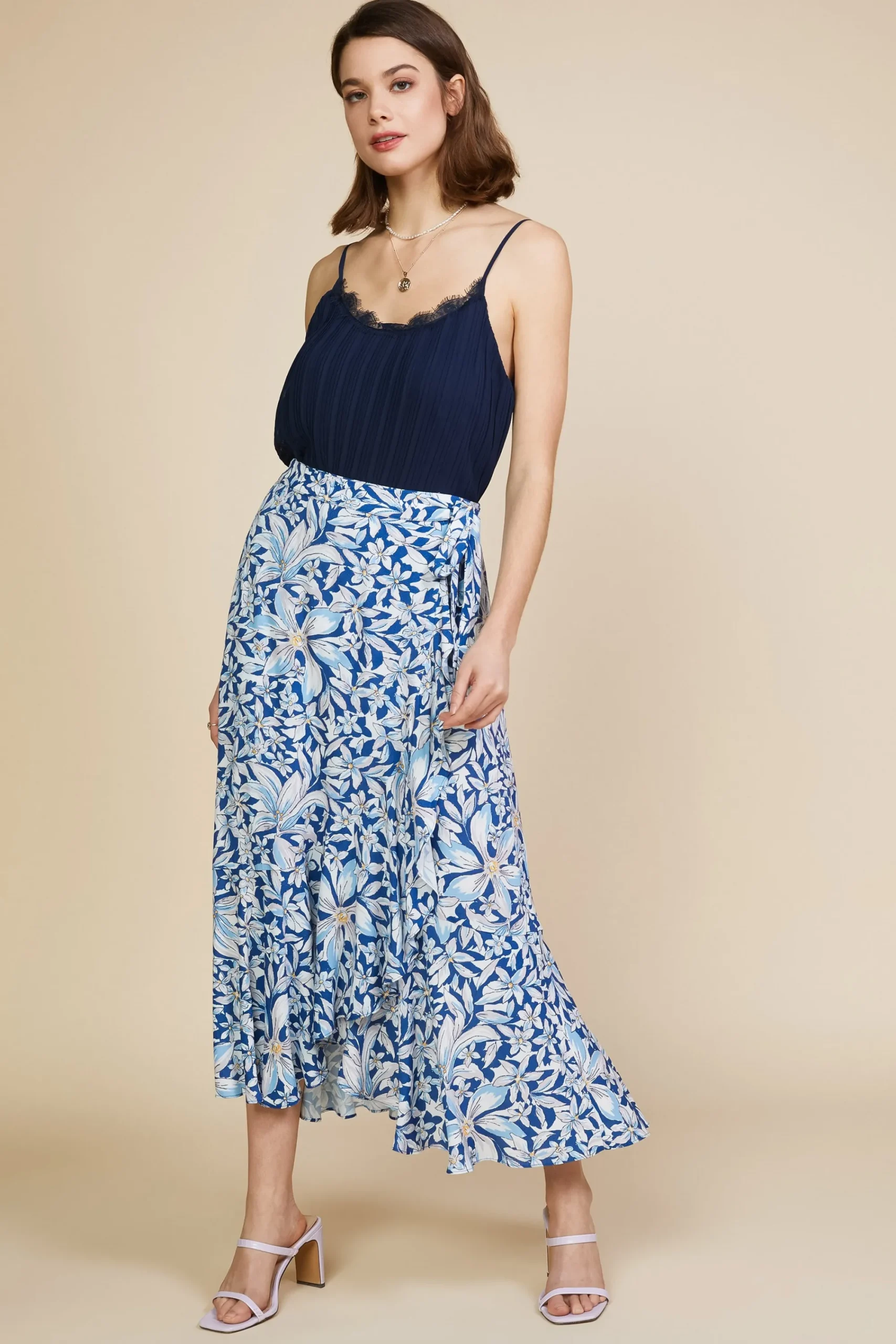 This floral-print wrap skirt is ready for days in the sun. It ties at the side waist and falls to a flowy, shin-grazing hem. The elasticized back waistband ensures a comfortable fit.