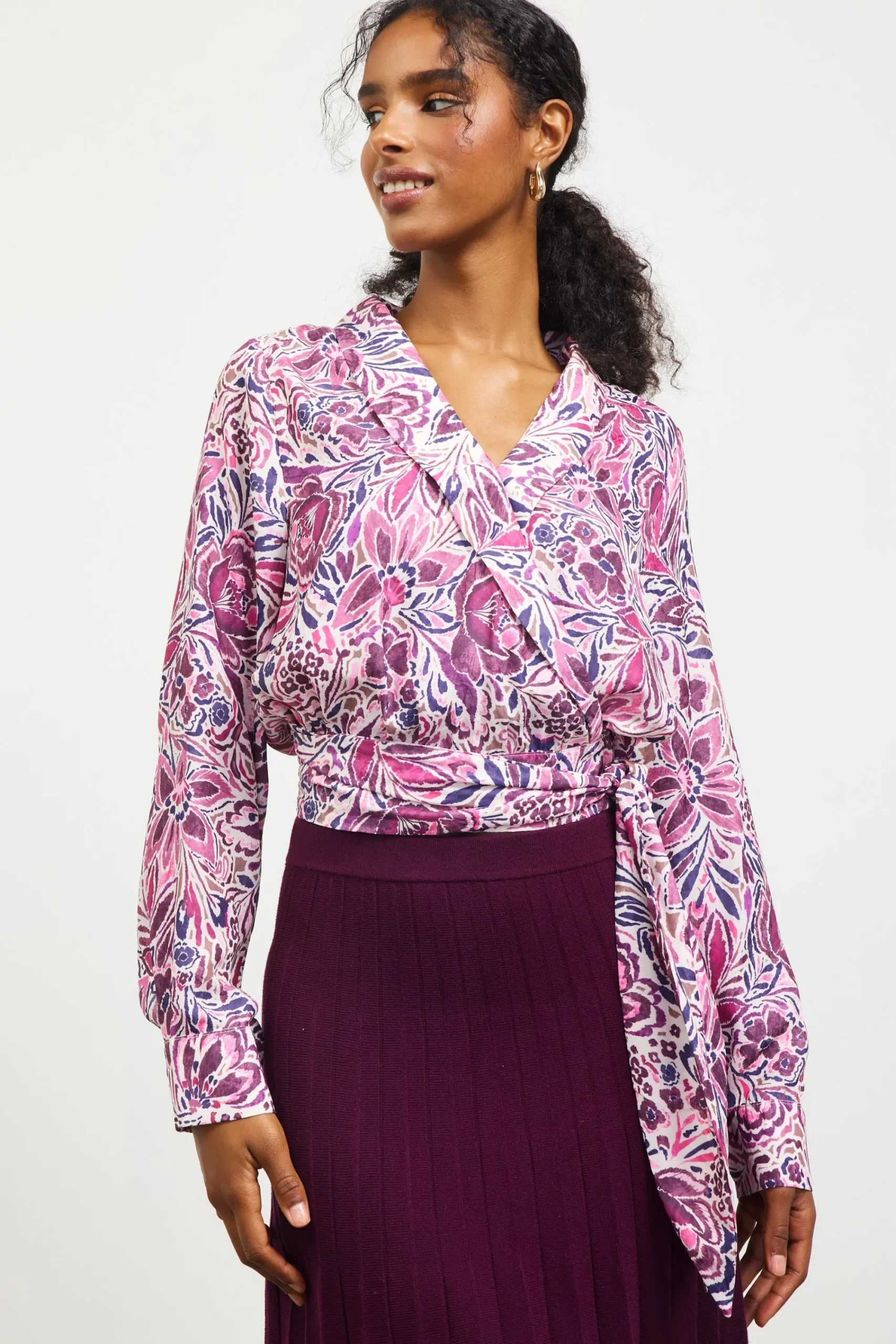Our wrap top serves as the perfect canvas for a charming floral print of pinks and purples. Defined by a graceful V-neckline and shawl collar, it’s cinched by an integrated self-tie and smocking at the back waist.
