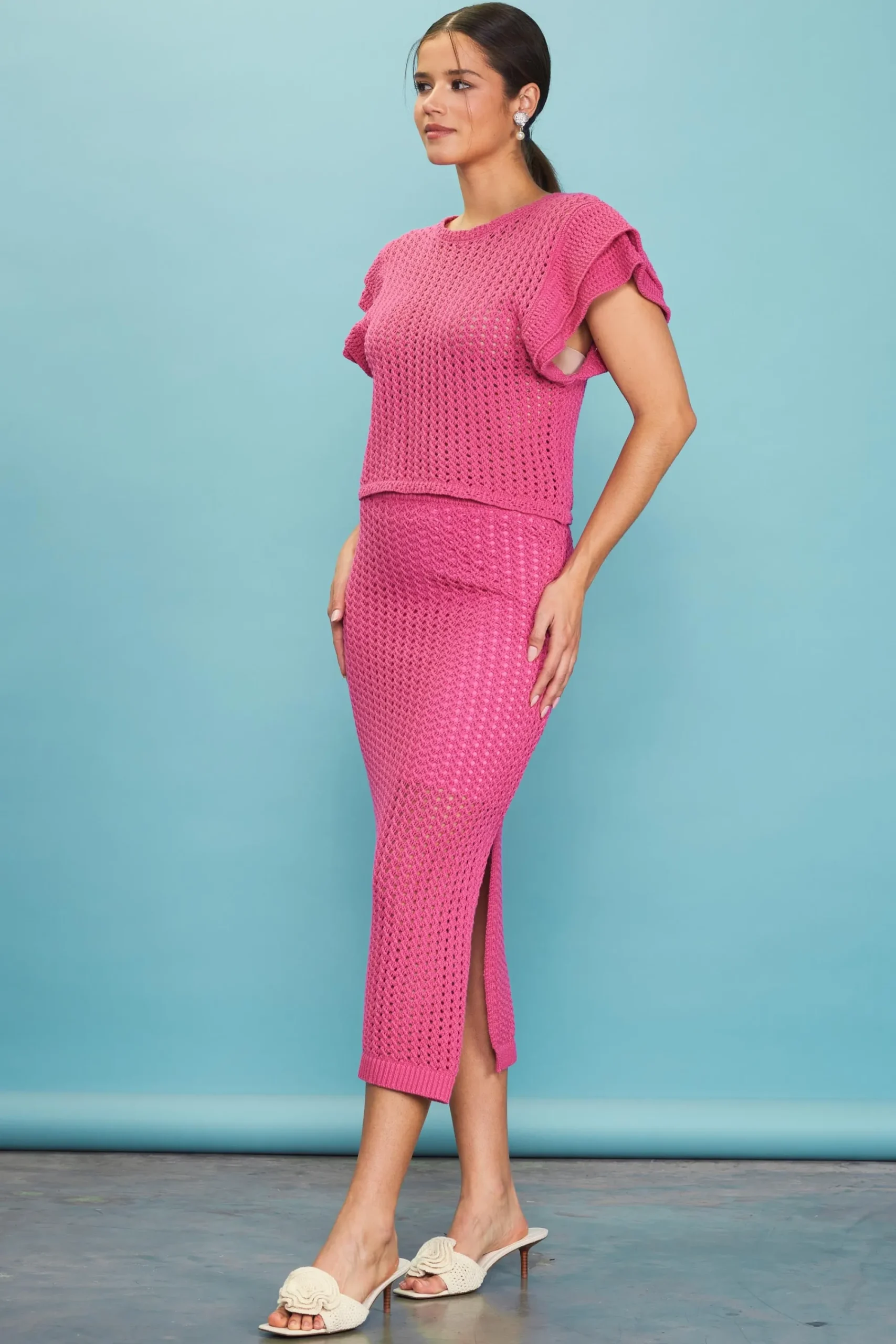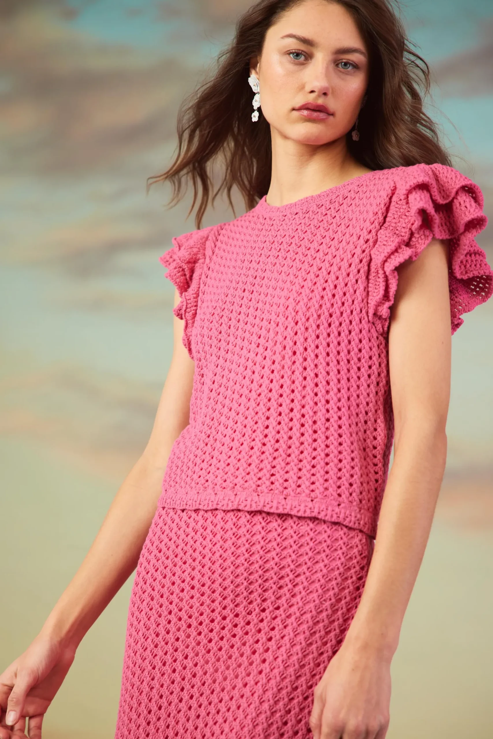 Embrace warmer days in this crochet top with layered flutter sleeves. Bright and fun, it’s got lots of texture and a sunny getaway vibe.