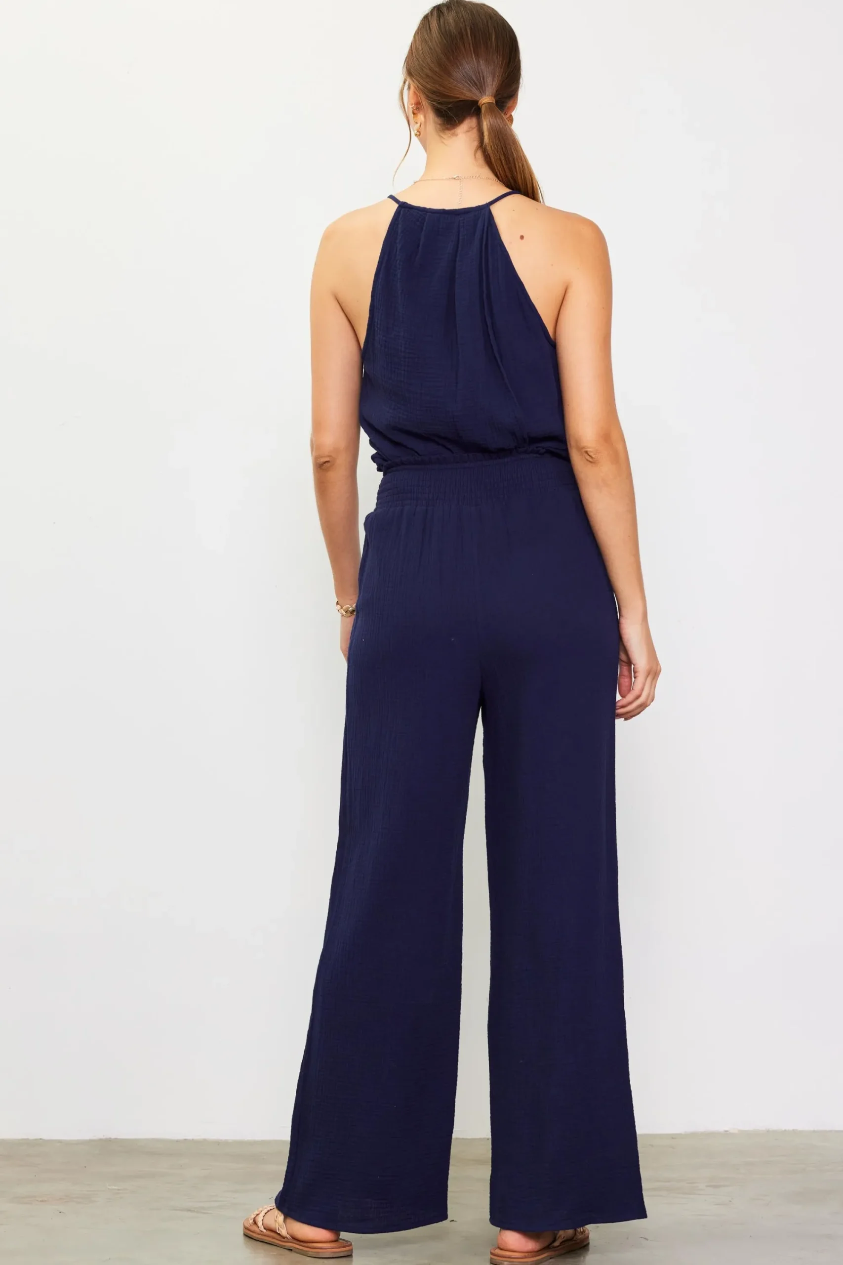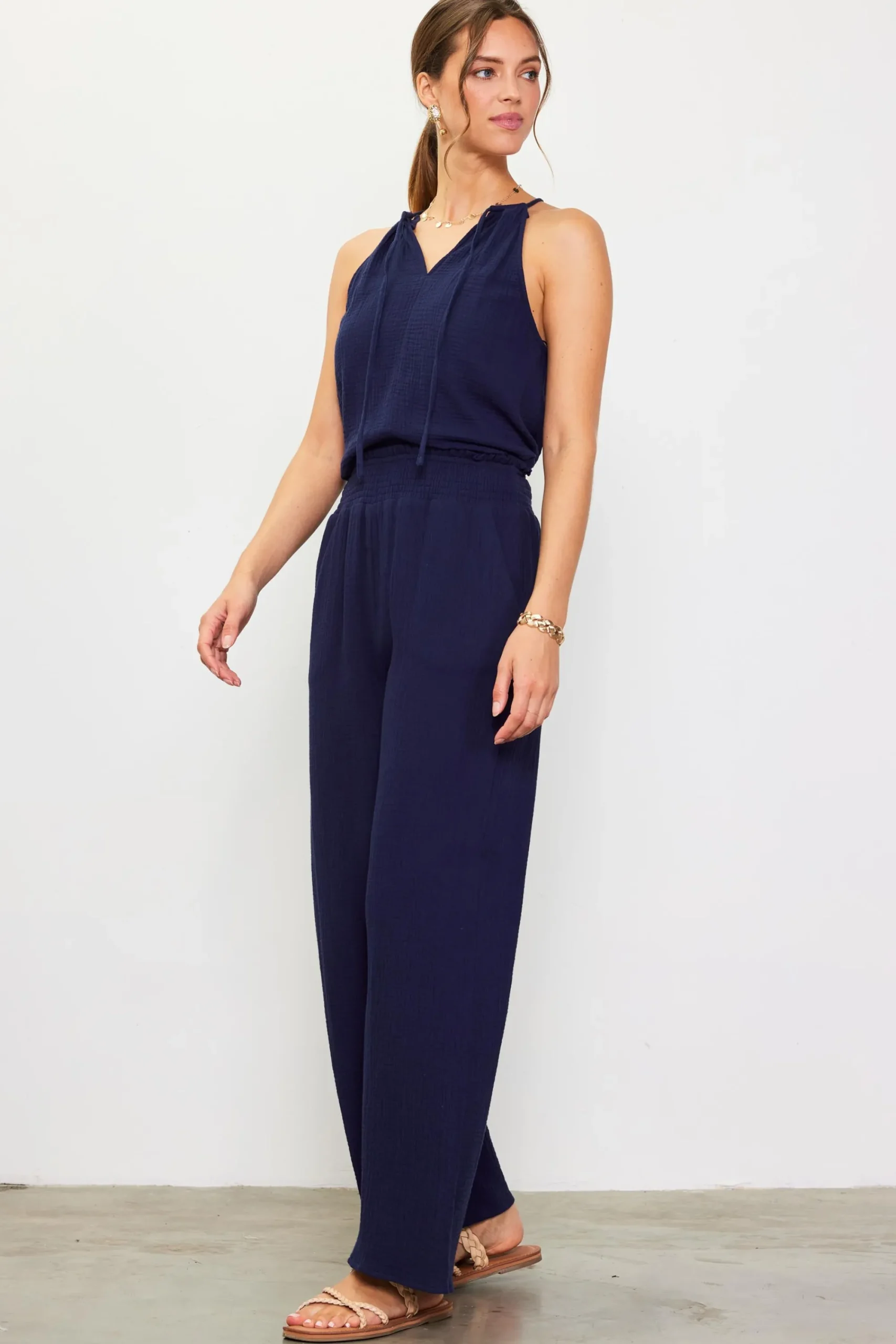 These gauzy wide-leg pants are the very definition of effortless. Lightweight with a gently crinkled texture, the navy pair slips on and wears comfortably thanks to its ruffle-adorned elasticized waist.