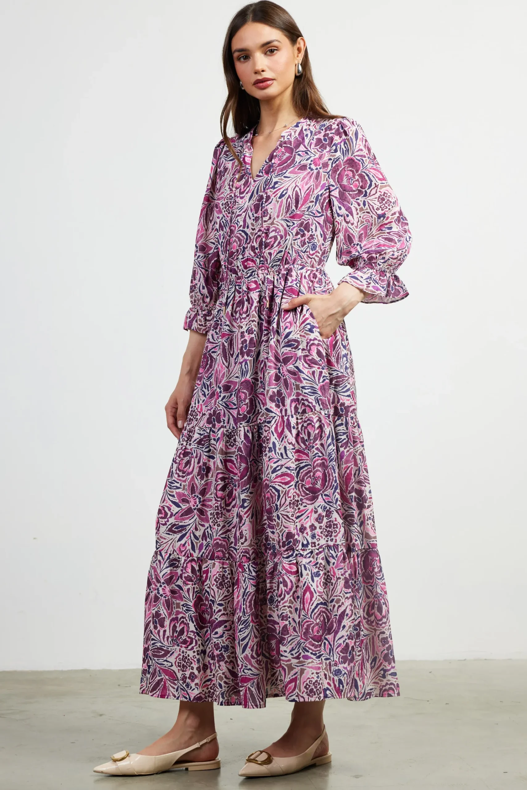 This printed maxi dress showcases a hand-drawn floral motif on airy jacquard. It’s got a split neckline, cinching at the waist, and three-quarter sleeves with ruffled cuffs, complemented by a flowy tiered skirt. Tie it at the neckline, or leave it undone for a casual feel.