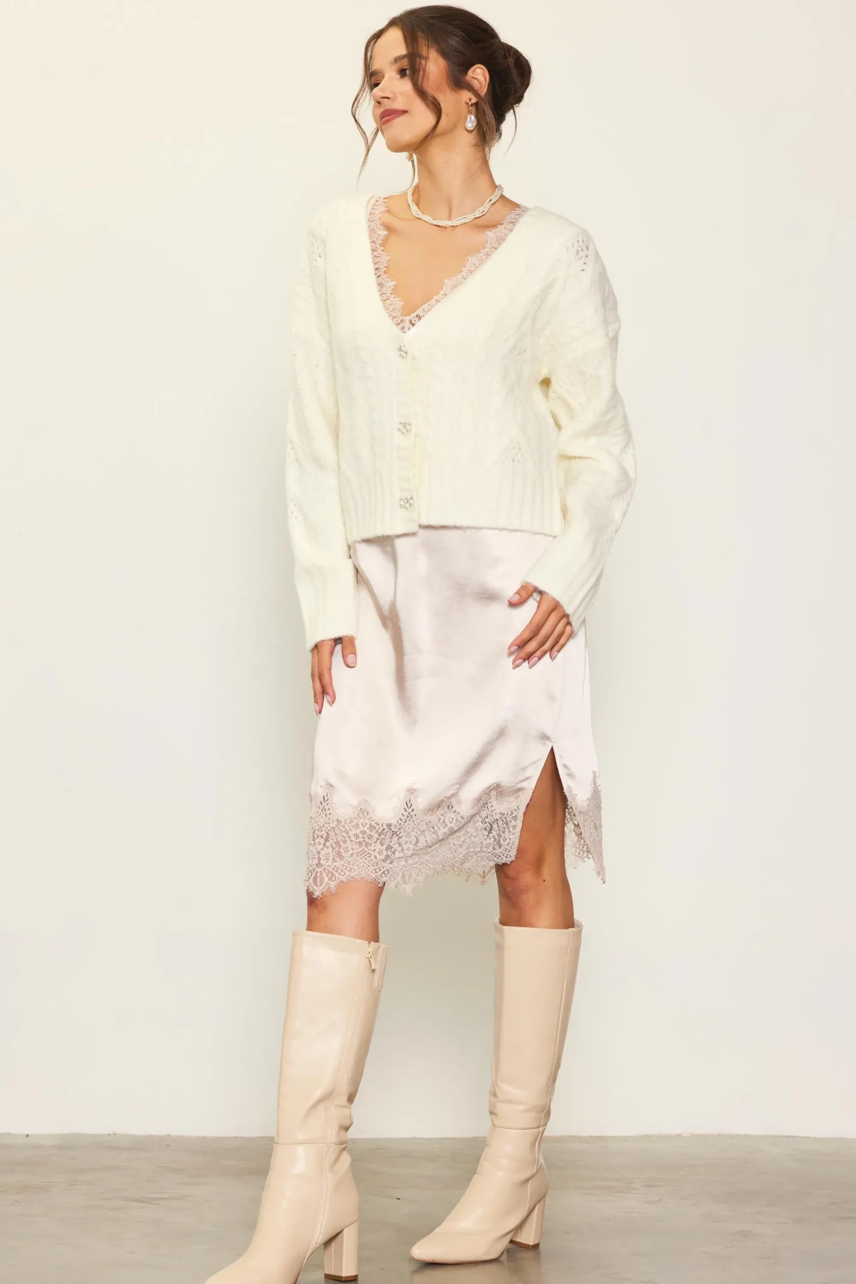 This softly textured cable-knit cardigan instantly brings something special to your outfits. Adorned with jewel-embellished buttons at the front, it dresses up your look and keeps you feeling cozy. An alluring addition to fall’s sweater lineup.
