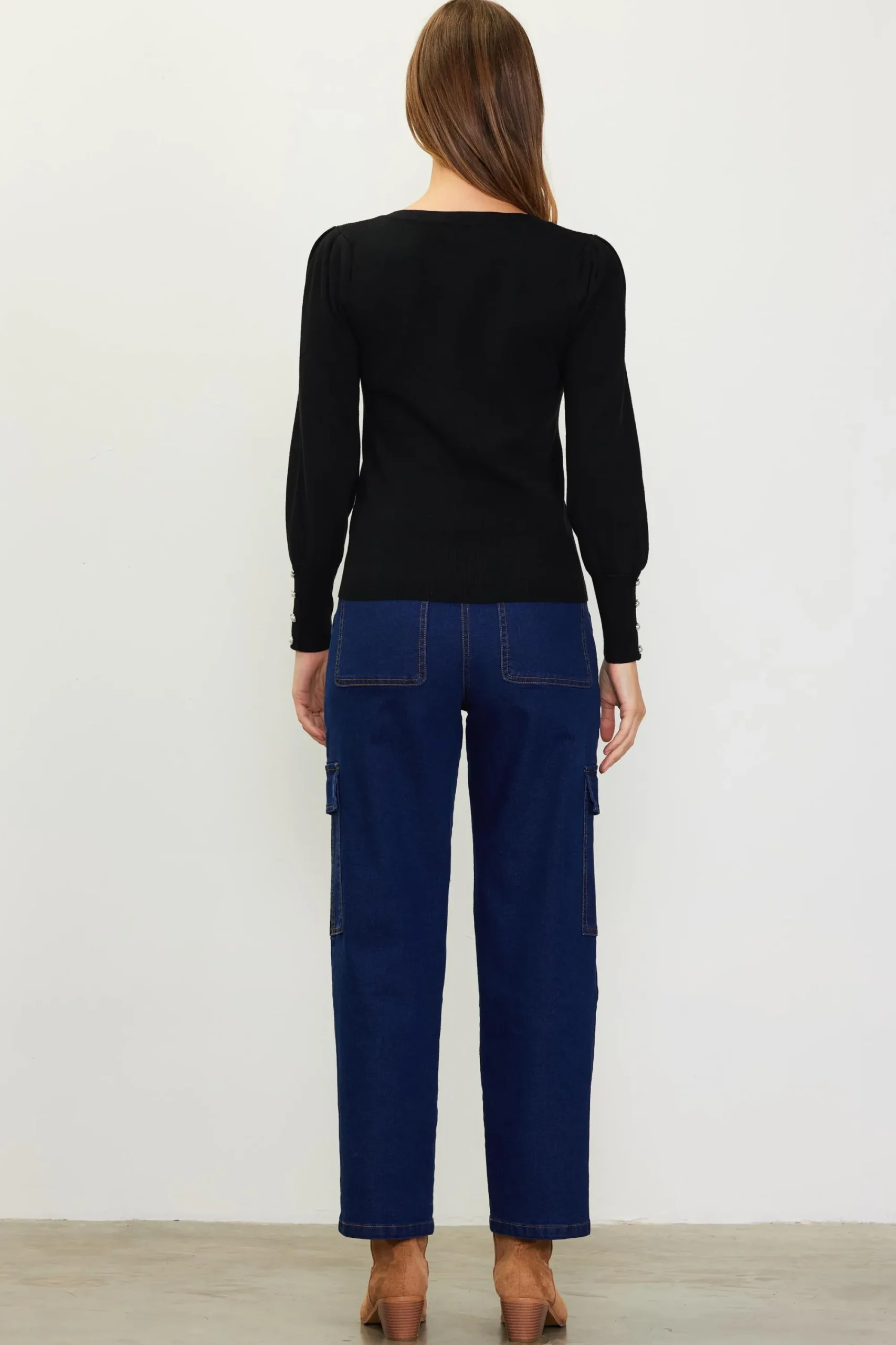 Decorative pearlized jewel buttons accent the cuffs of this cozy long-sleeve sweater. It’s an elegant touch that elevates the classic pullover style.