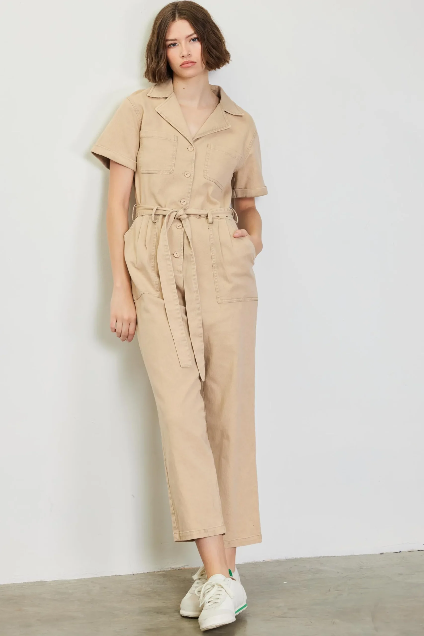Washed down for a faded character, this straight-leg jumpsuit has cuffed short sleeves, utility-inspired pockets, and a removable tie belt to define the waist. Cropped to the perfect ankle length, it’s an effortless one-and-done outfit.