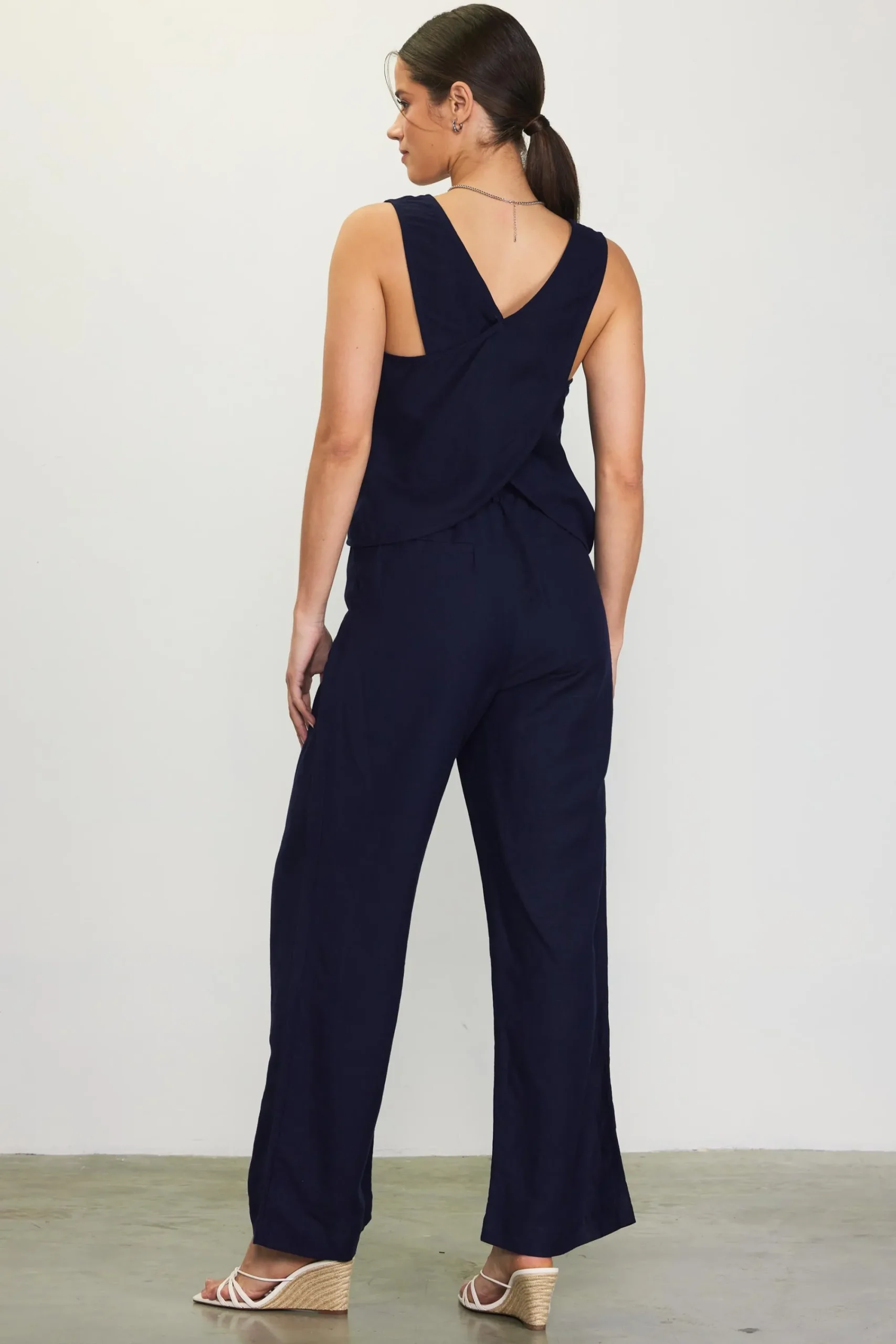 Cut from an airy linen blend, this relaxed tank has a square neck, wide straps, and a crisscross back. Add the matching wide-leg trousers for an effortless ensemble.