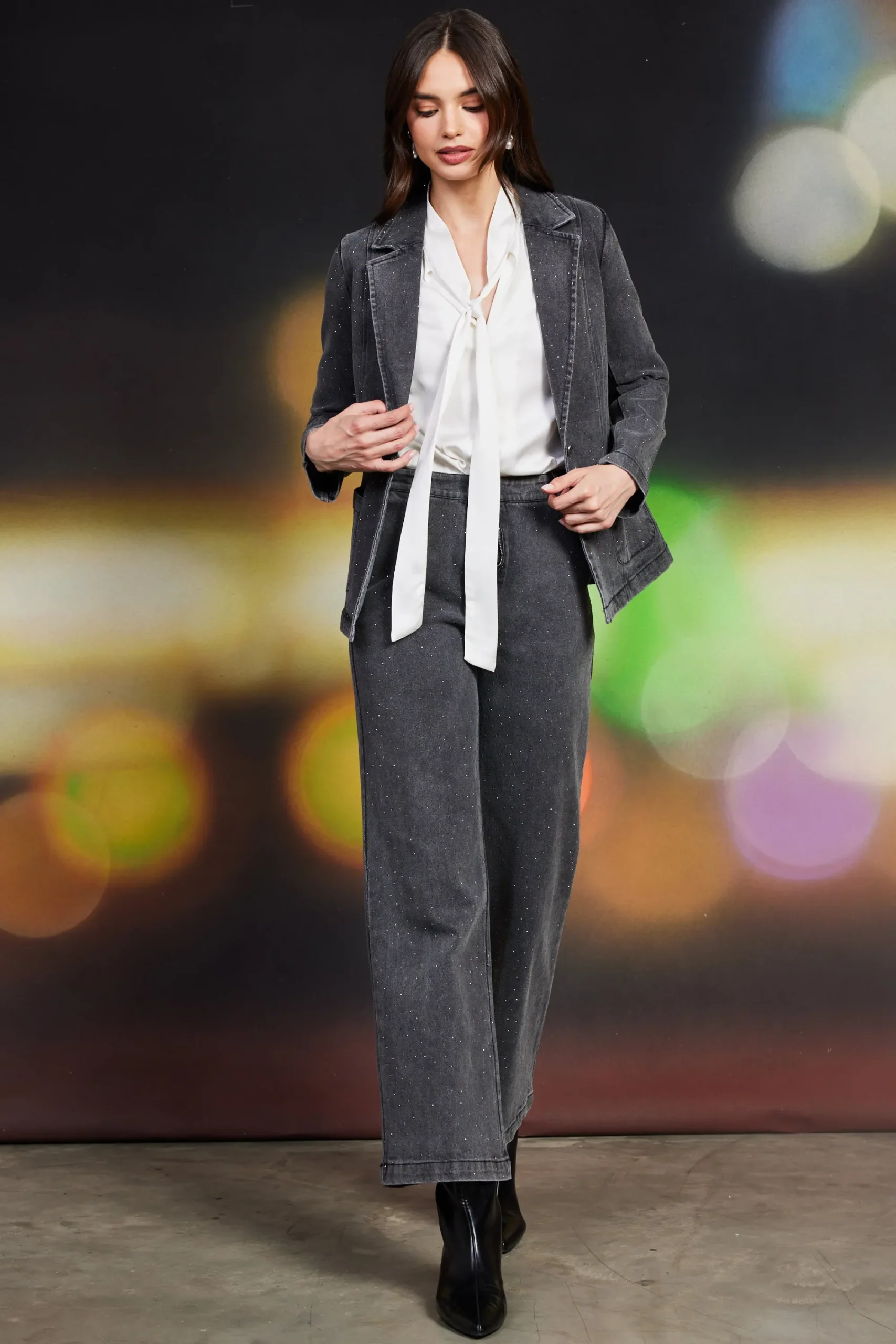 Tiny rhinestones catch the light on these wide-leg denim pants in a faded black wash. Detailed with a partially elasticized waist for added comfort, this pair features slant front pockets and welt pockets at the back.