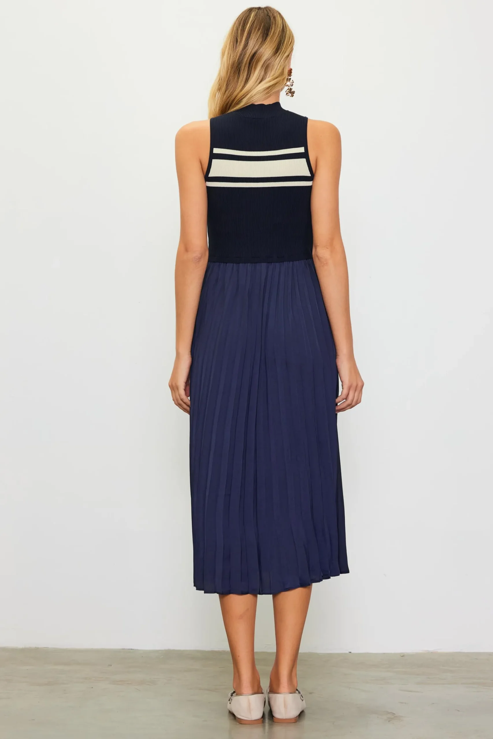 On top, this mixed-texture dress features a sleeveless mock-neck sweater top in a navy ribbed knit with cream stripes. Down below, the mid-length woven skirt falls to swishy pleats. Pair it with sneakers or boots during the day and dress it up with heels at night.