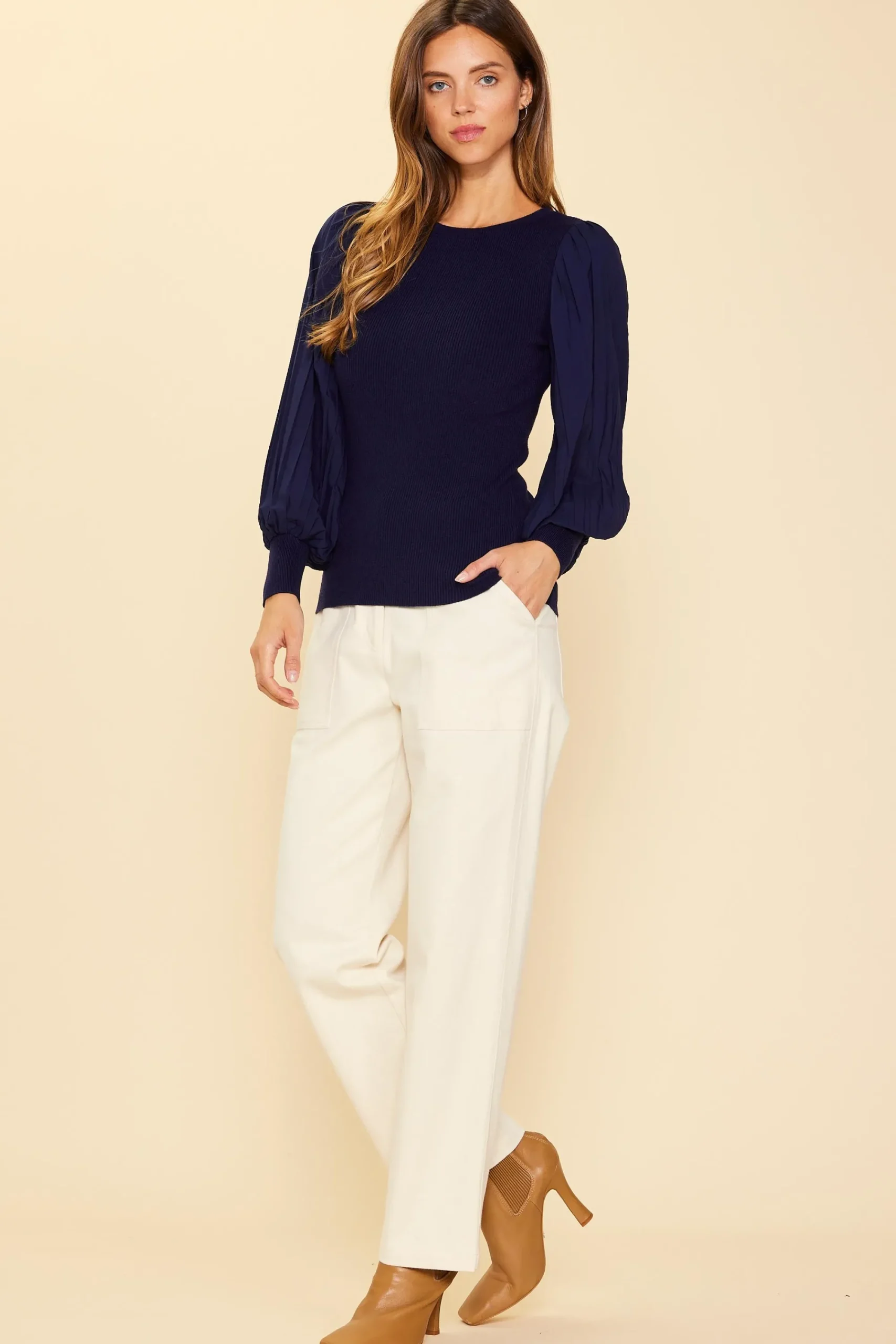 Made from a figure-hugging rib knit, this top has a round neckline and long, pleated sleeves in a lightweight woven fabric. Knit cuffs draw in the shape.
