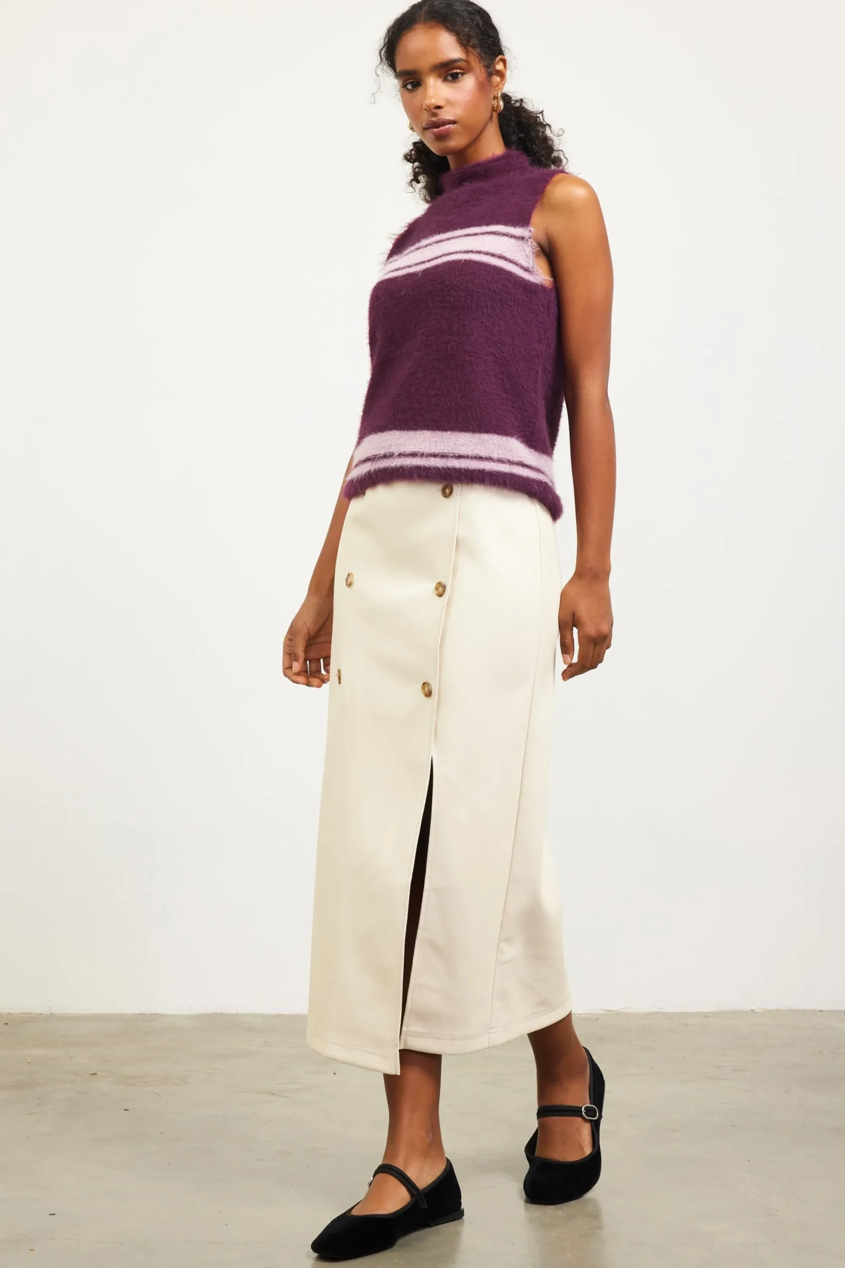 This fuzzy mock-neck top is knitted with stripes across the bust and hem. The silhouette is simple and sleeveless, finished by a little keyhole at the back.
