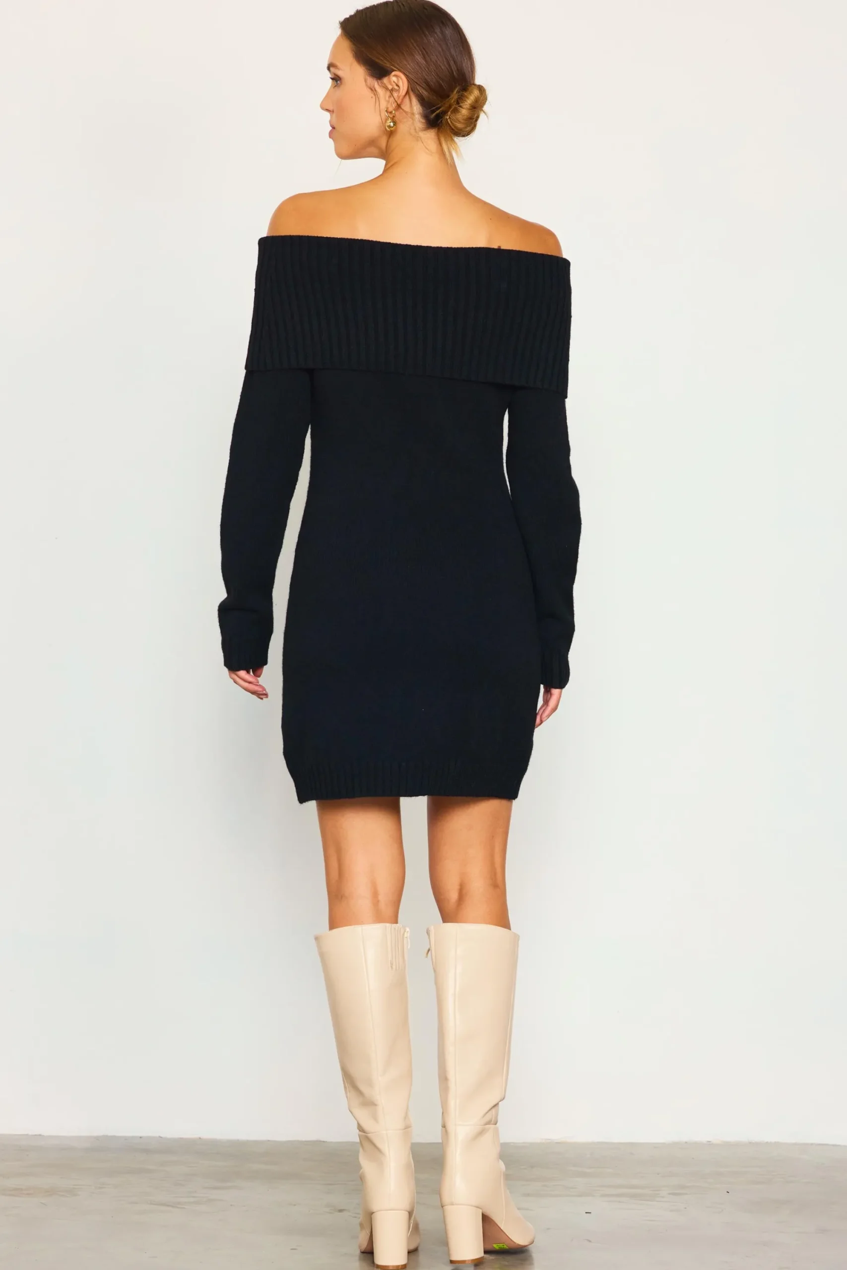 This cozy sweater dress will be an instant favorite for the cooler months. It’s soft and warm, done in a figure-hugging silhouette with off-the-shoulder styling.