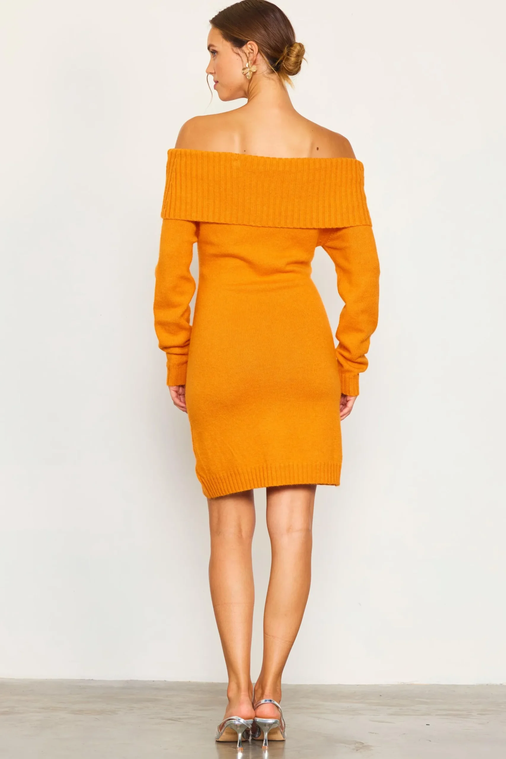 This cozy sweater dress will be an instant favorite for the cooler months. It’s soft and warm, done in a figure-hugging silhouette with off-the shoulder styling.