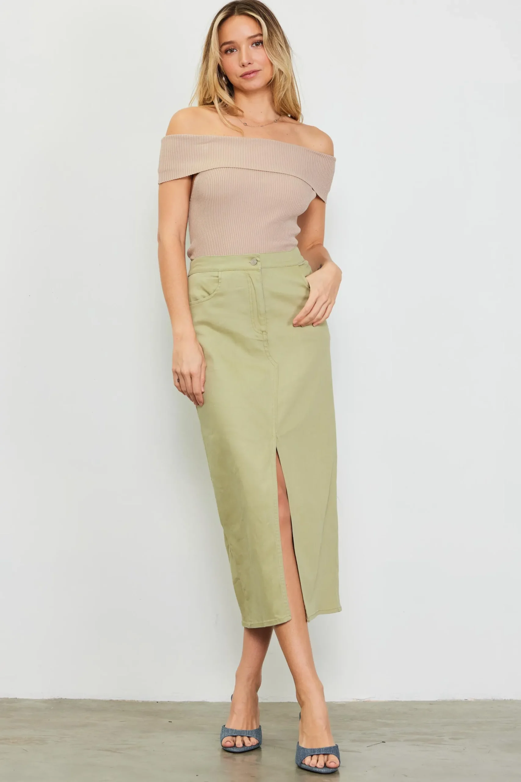 Defined by foldover styling, this off-shoulder top hugs the figure in a soft rib knit. A simple, feminine piece that can be styled with jeans, wide-leg trousers, skirts, anything.