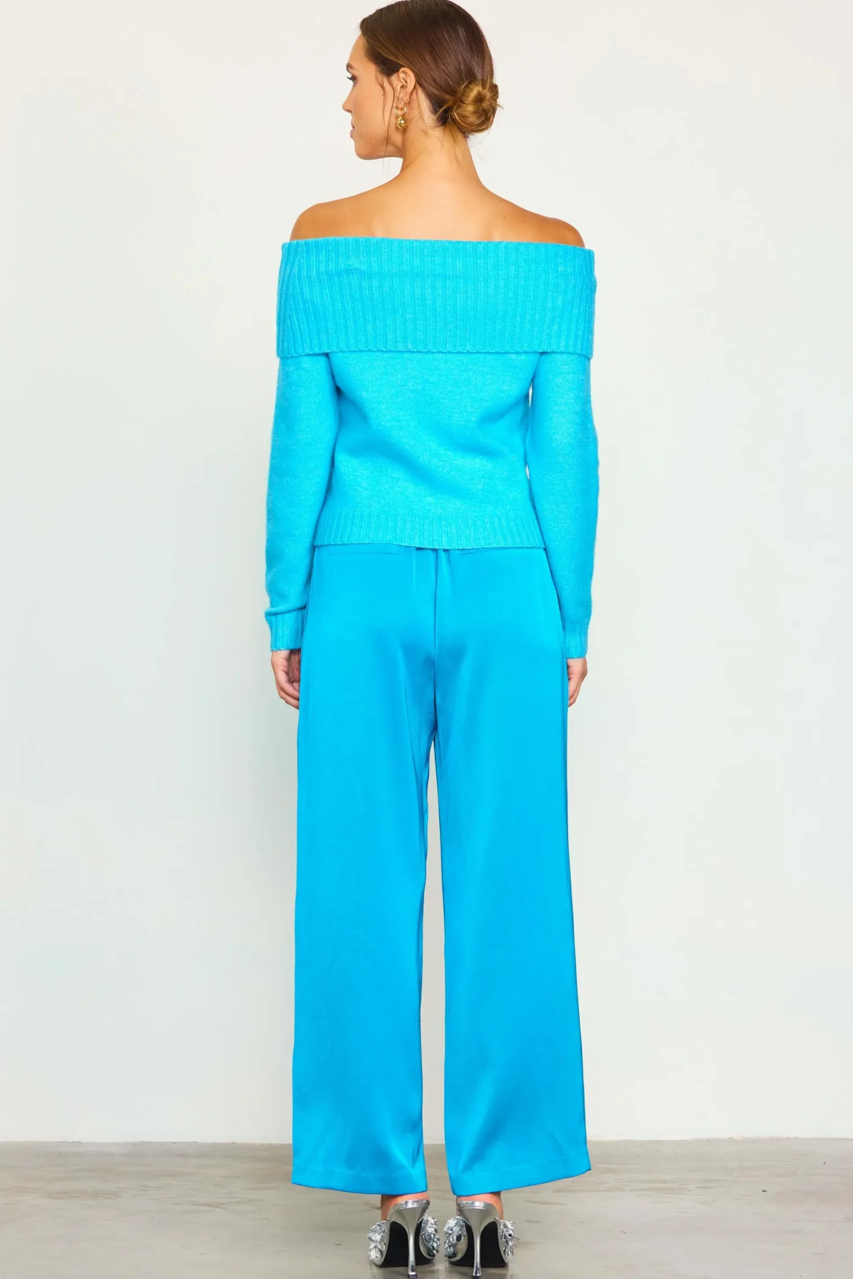 A soft and cozy sweater has an alluring silhouette thanks to its off-the-shoulder styling. A flirtatious addition to your knitwear collection.