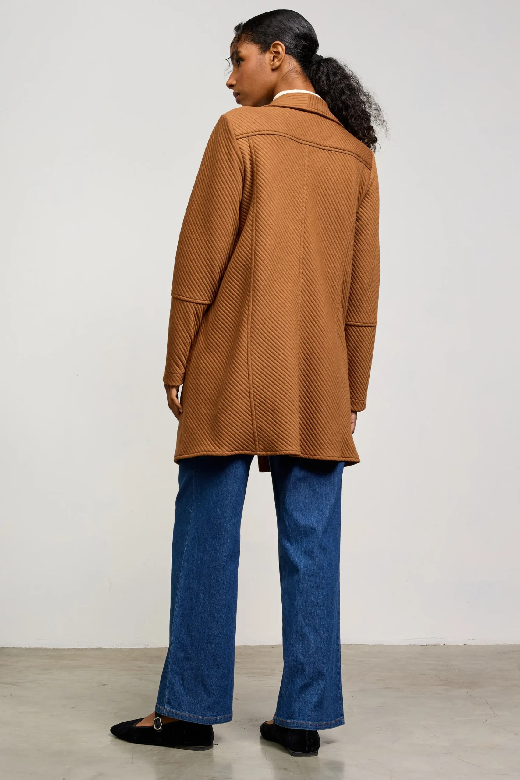 Throw on this open-front cardigan at the slightest hint of chill. Made from a quilted knit, it’s got longer lines, paneled sleeves, and an exaggerated collar for a modern statement.