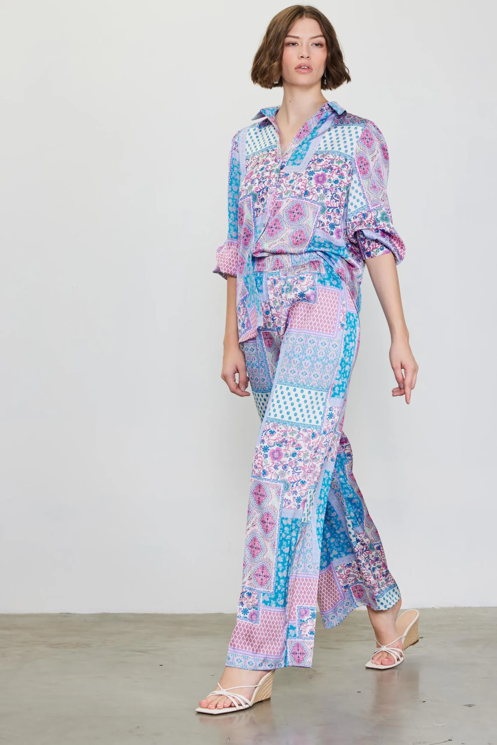 A mix of complementary prints adds flair to this button-up blouse. Cut for a relaxed fit, it’s got a pointed collar, covered buttons, and long sleeves with gently gathered detailing.