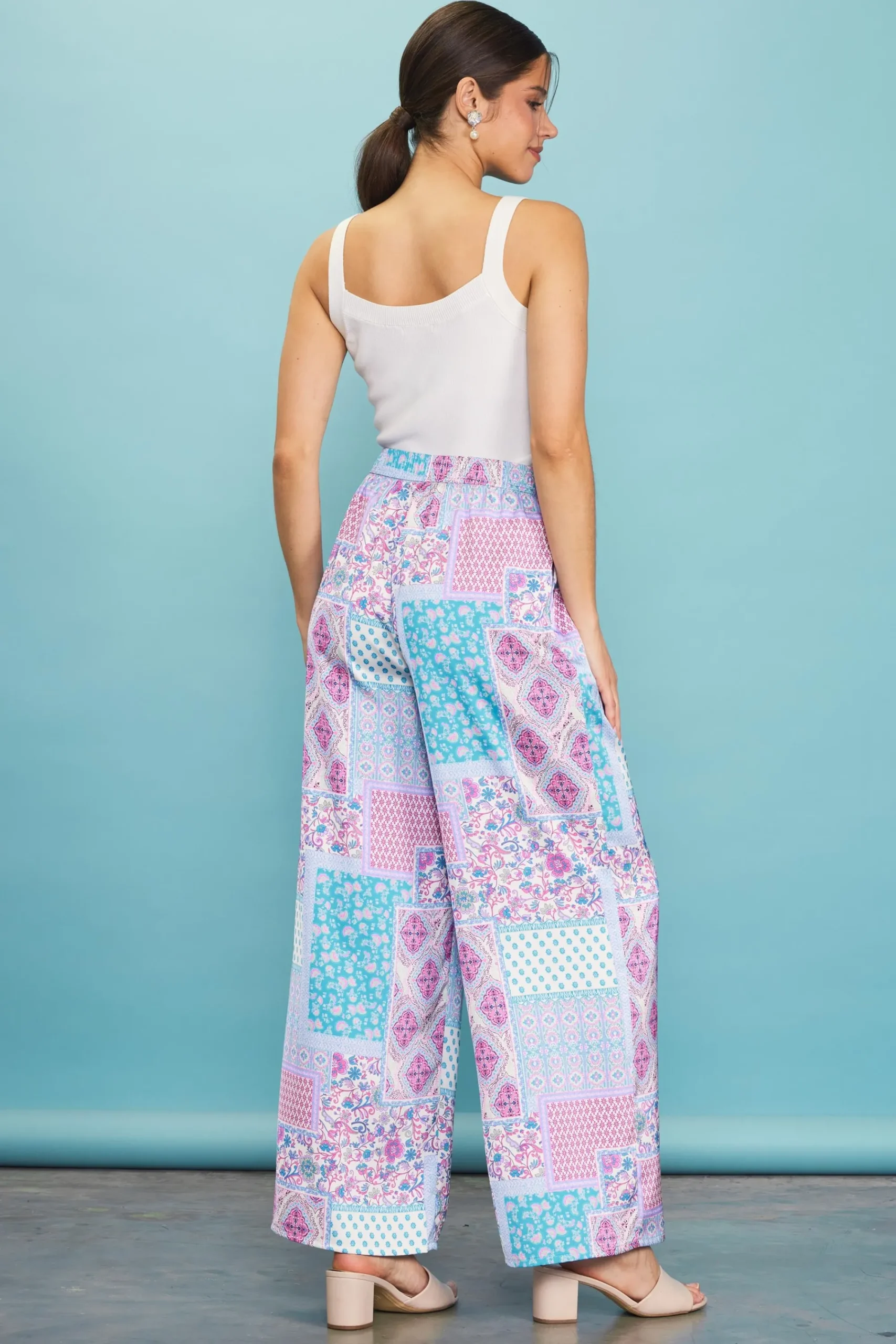A pair of wide-leg pants evokes a bohemian sensibility in a patchwork print. Topped by an elasticized waistband, the style is loose, relaxed, and easy to wear with its pull-on design.