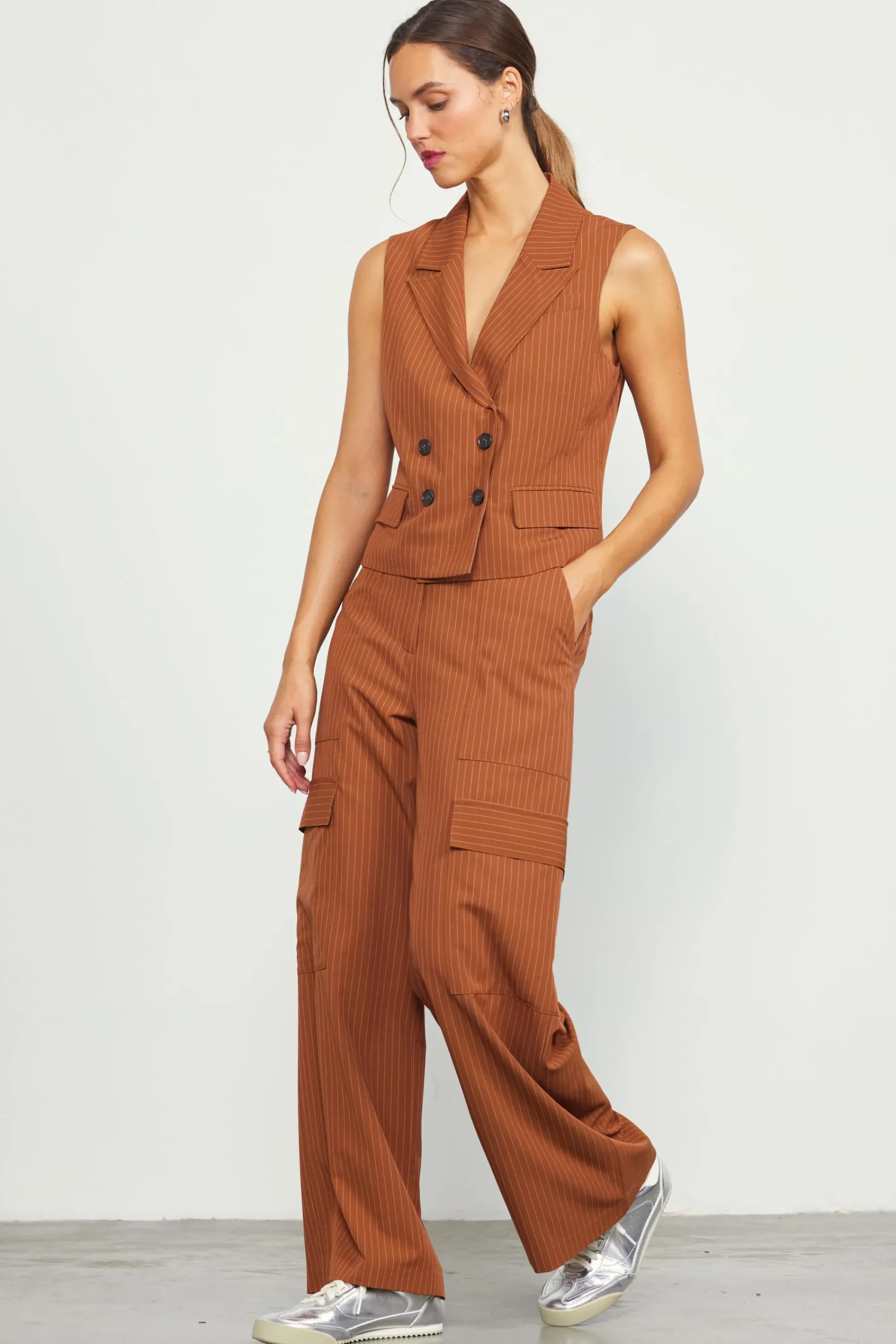 Menswear-inspired tailoring, updated for the warmer months. Done in classic pinstripes, this double-breasted vest features a sleeveless silhouette with peak lapels and flap pockets. Go for a summer take on the power suit by pairing it with our pinstriped jumpsuit or the matching pants.