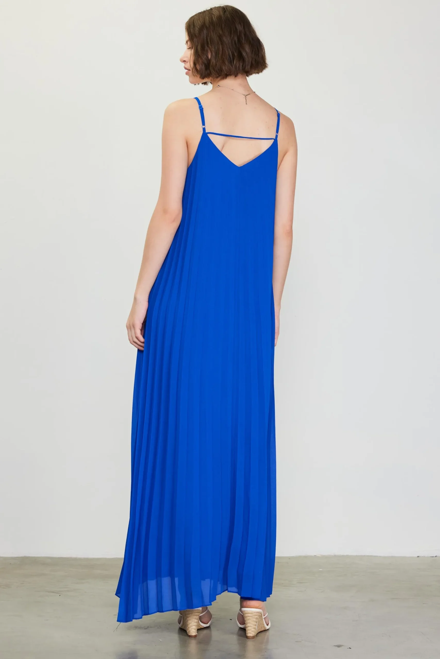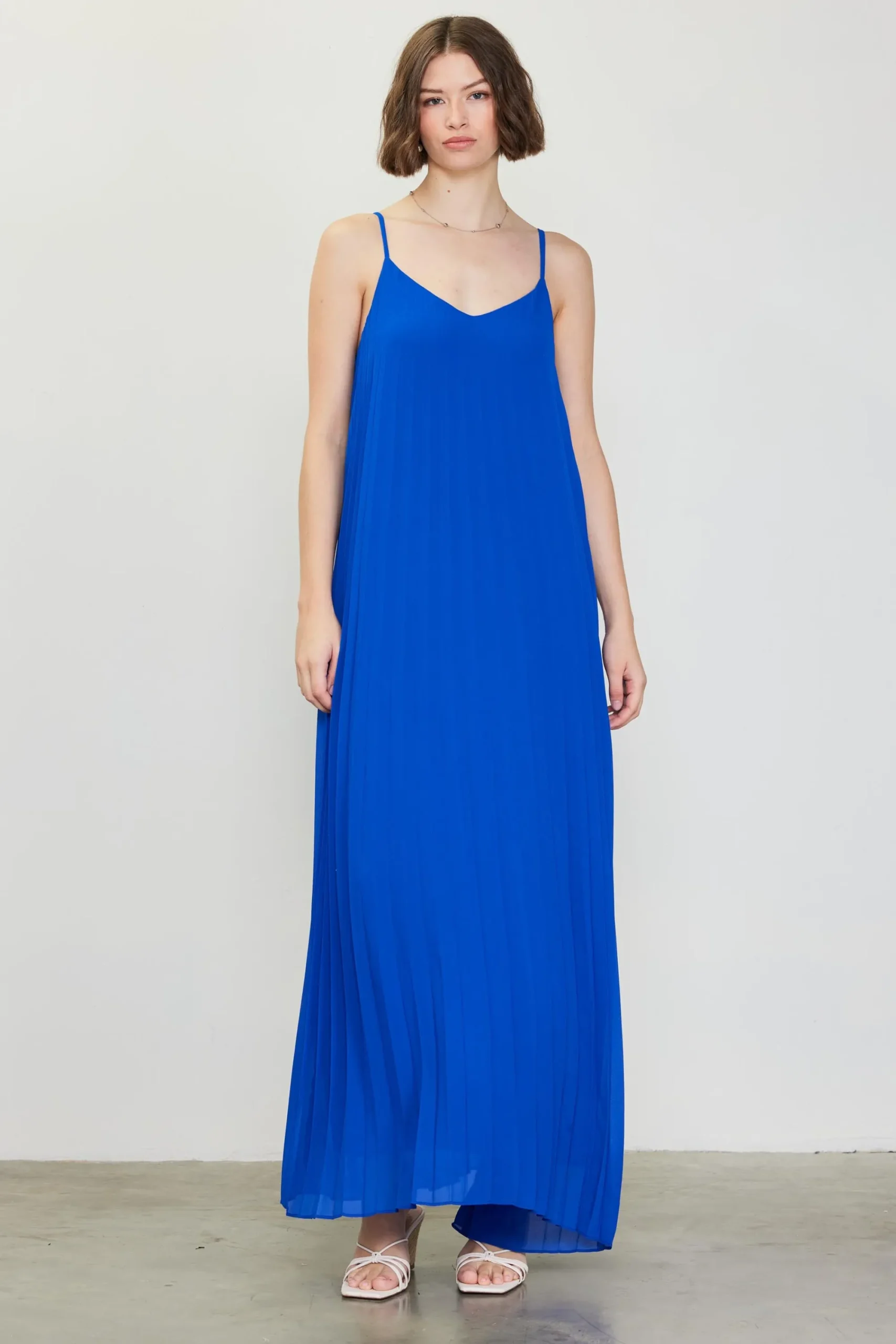 Simple yet striking, this strappy maxi dress has a loose, languid silhouette of flowing pleats that drop to the floor. It’s accented by a slim strap that crosses the back.