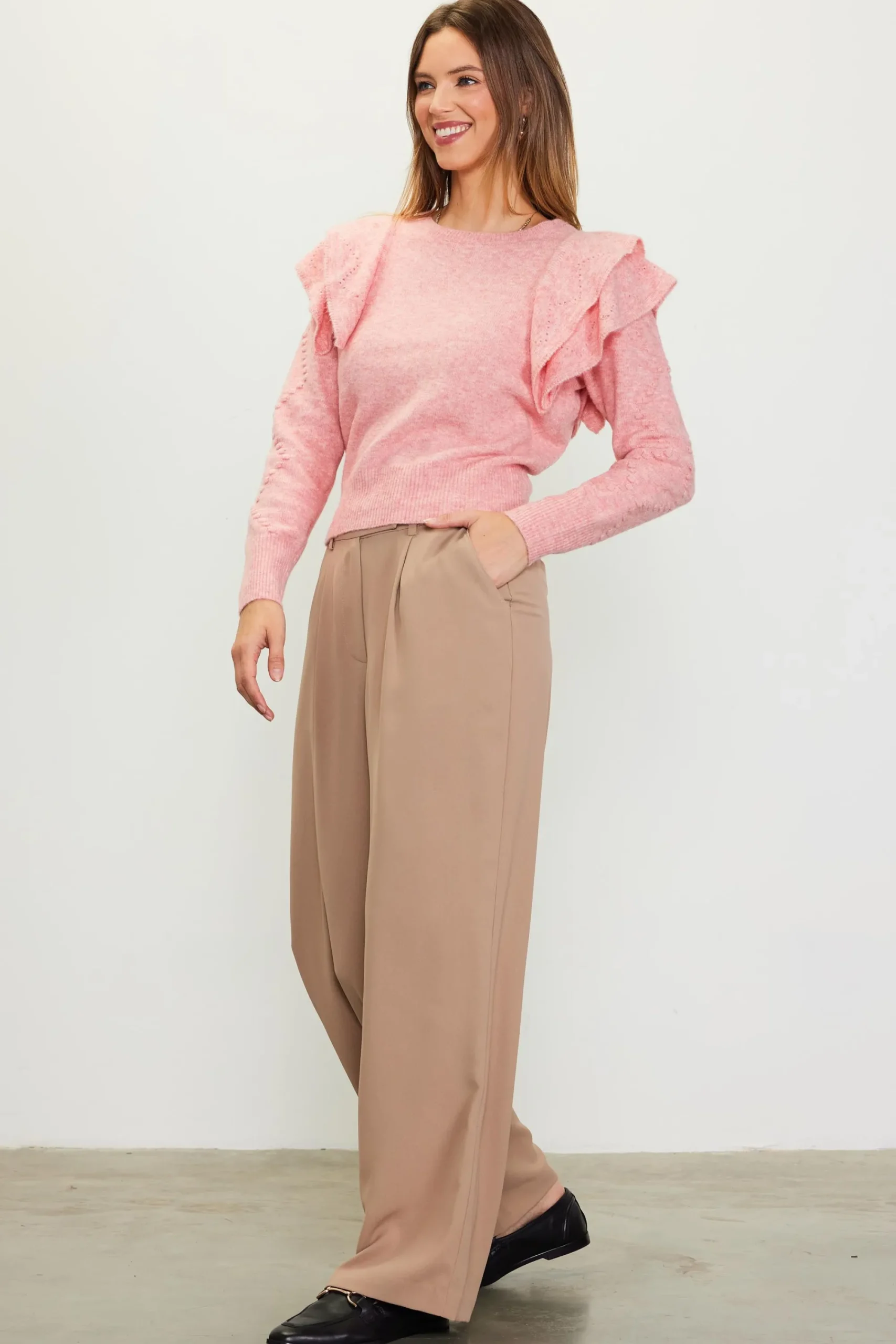 Pointelle-knit ruffles flutter at the shoulders of this cozy sweater with long, texture-rich sleeves. It’s a fun, feminine addition to your knitwear collection.
