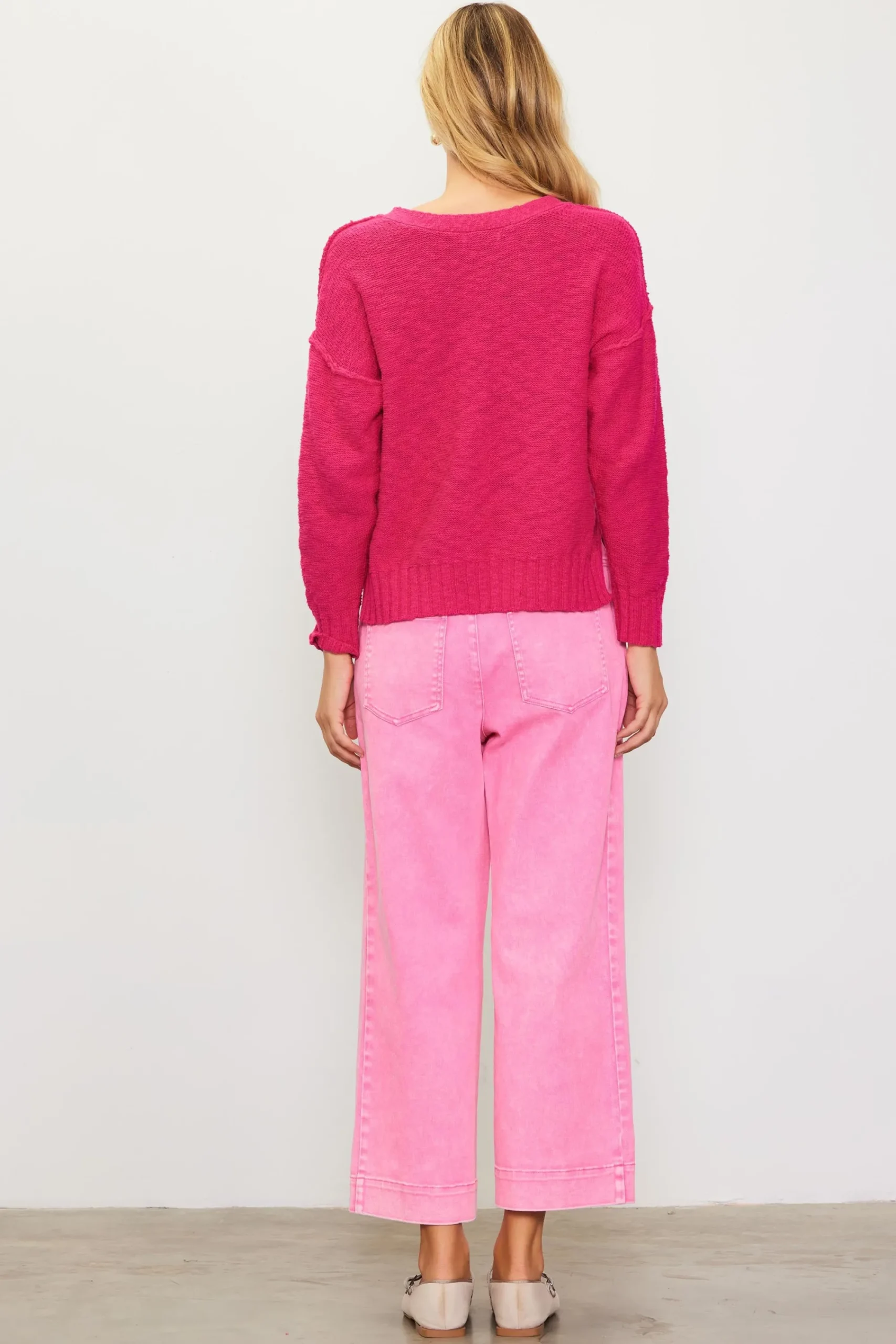 Designed for a slouchy fit, this V-neck sweater has dropped shoulders with exposed seam detailing. Chunky rib stitching at the cuffs and hem complete the cozy design.