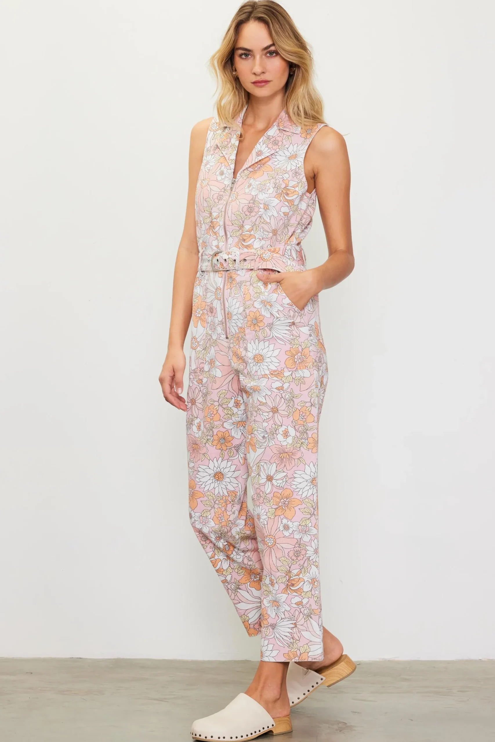 A fun play on one-and-done outfitting. This sleeveless twill jumpsuit is printed with a retro-inspired floral motif in a pastel color palette. Cut with slightly flared hems, it zips up at the front and features a notched collar, patch pockets, and a buckle belt to define the waist.
