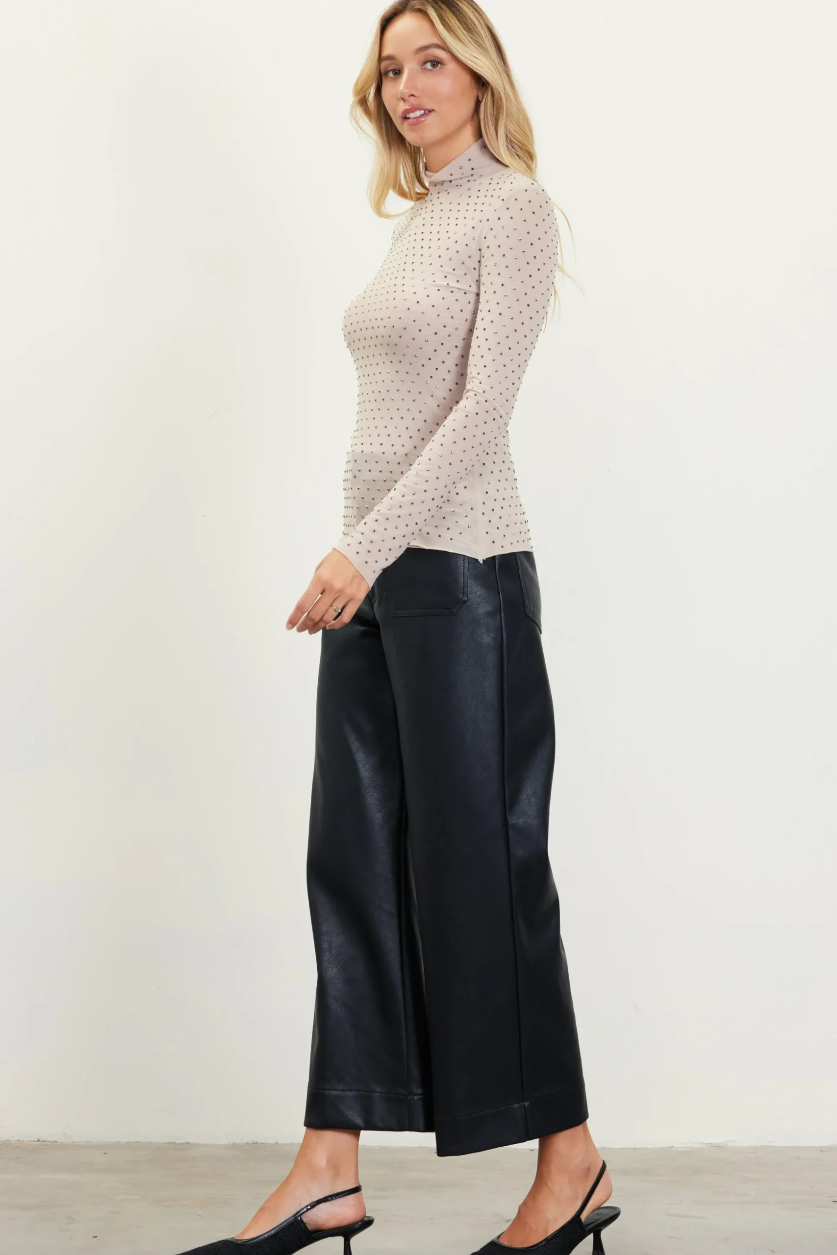 This mock-neck top shines from every angle. Crafted from stretch mesh, it’s cut for a close fit and dotted with glimmering rhinestones. The raw cuffs and hem lend a bit of edge.