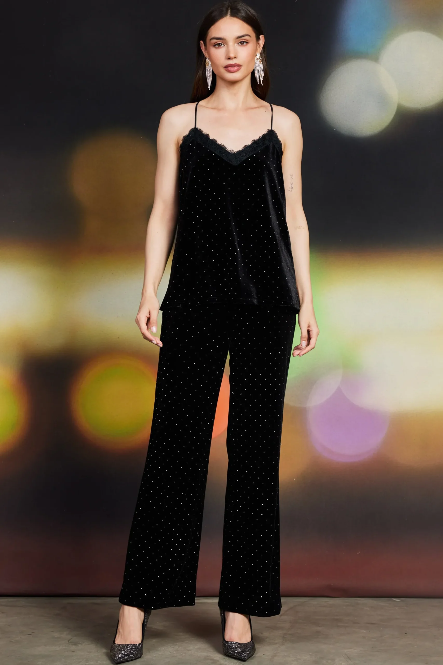 Accented by delicate eyelash lace, this velvet cami top is dotted with little rhinestones. It’s slinky and strappy, designed in a relaxed fit with a racer back and split sides.