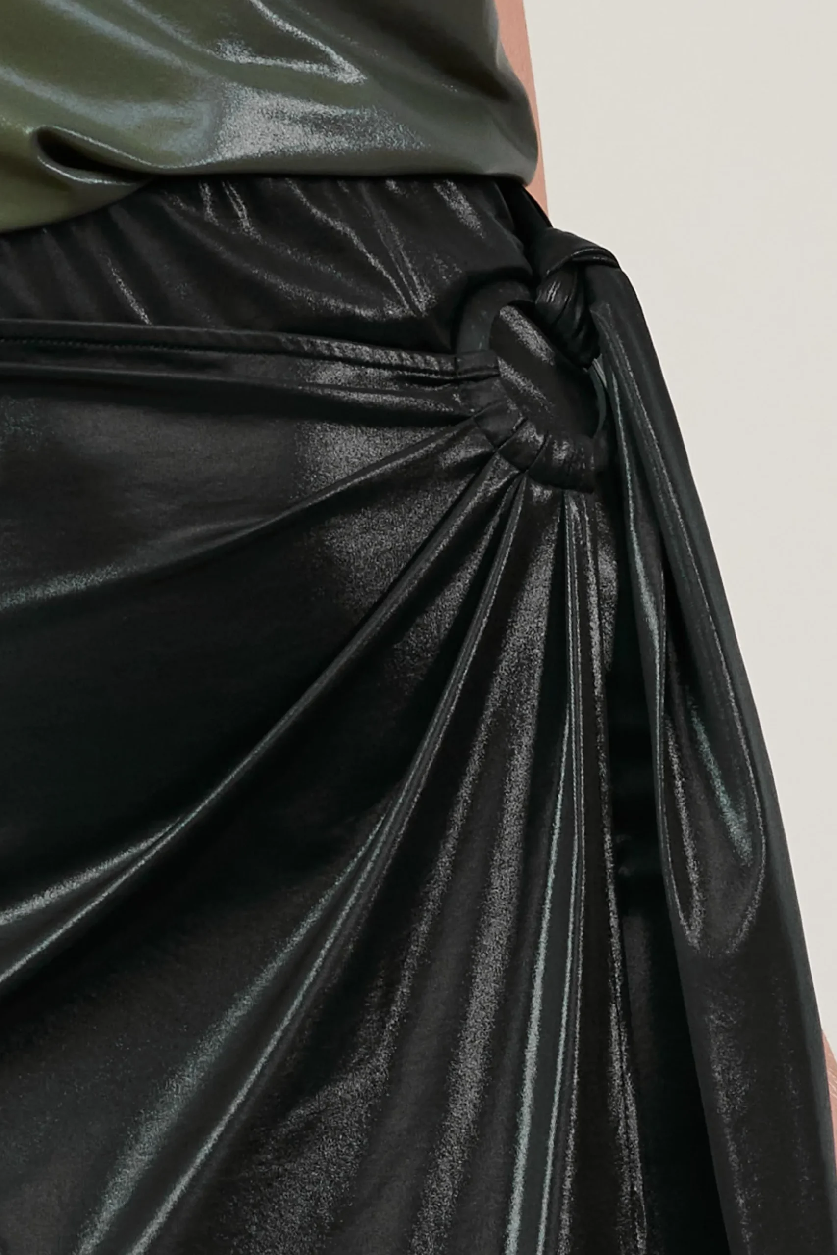 Sleek and lustrous, this black midi skirt has a wrap-style overlay with a tonal O-ring and a knotted sash. Sitting high on the natural waist, it glides against the body and has a sexy split at the front before landing at a slightly angular hem.