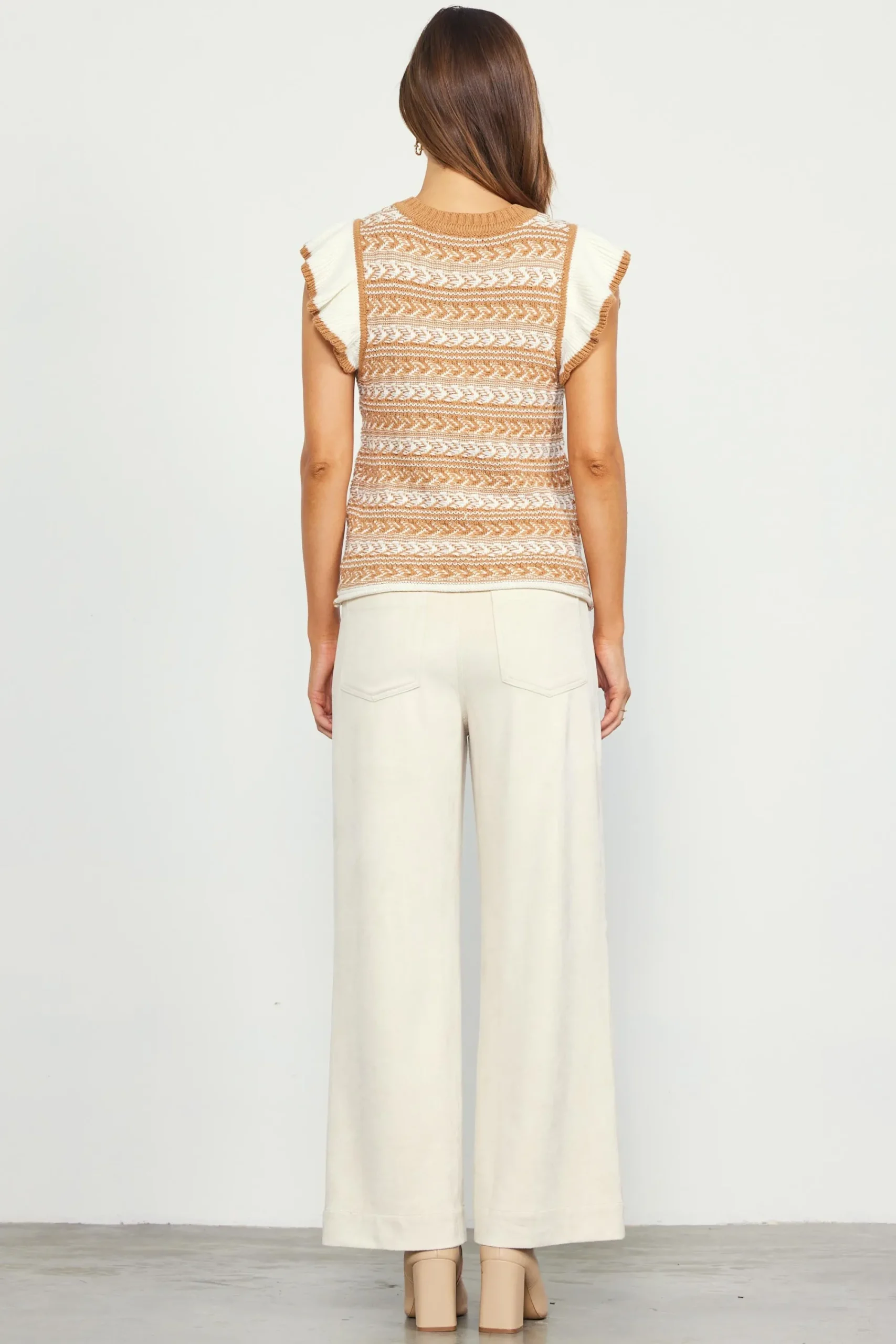 This summer-ready sweater has lots of texture thanks to a mix of stitches throughout. It’s designed with a round neckline and short, ruffled sleeves, plus a rolled hem for a slightly relaxed finish. The perfect knit top for warmer months.