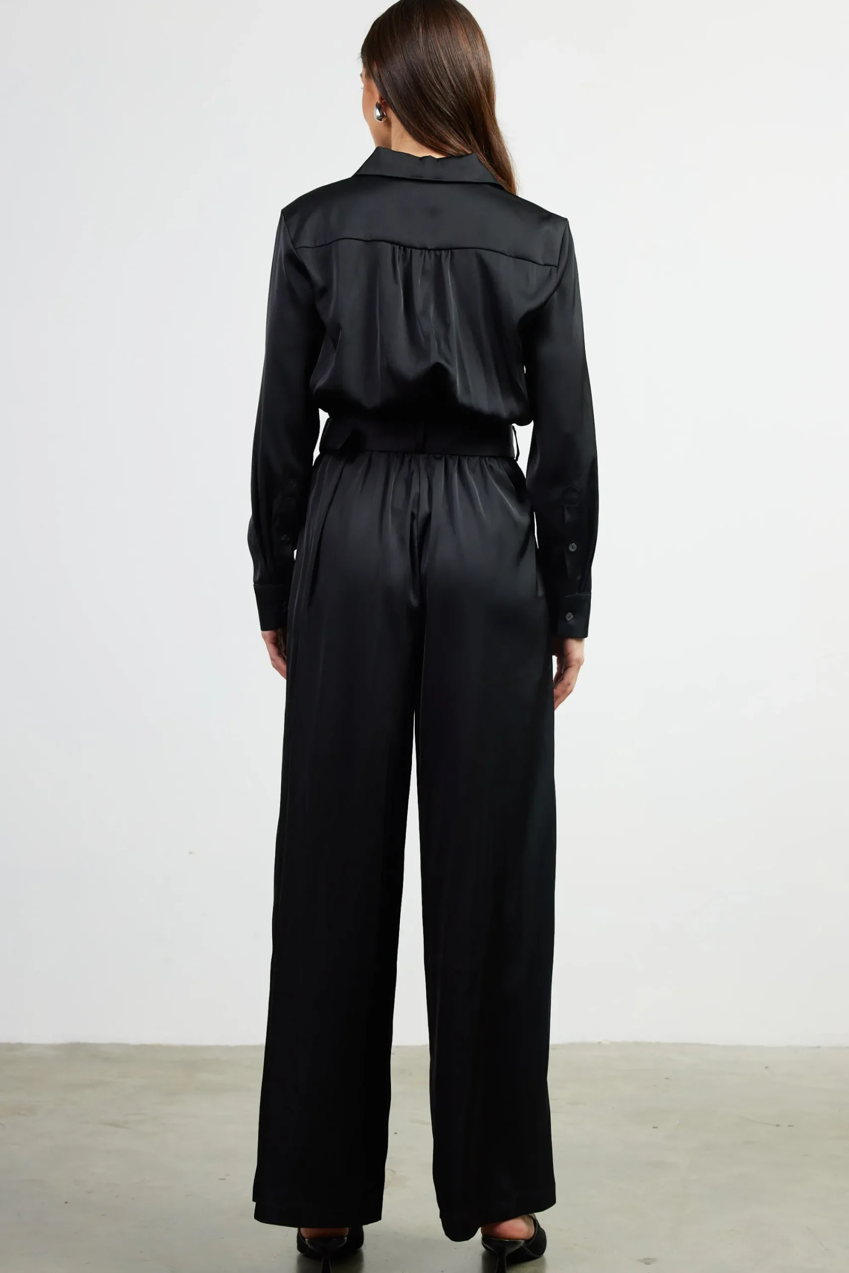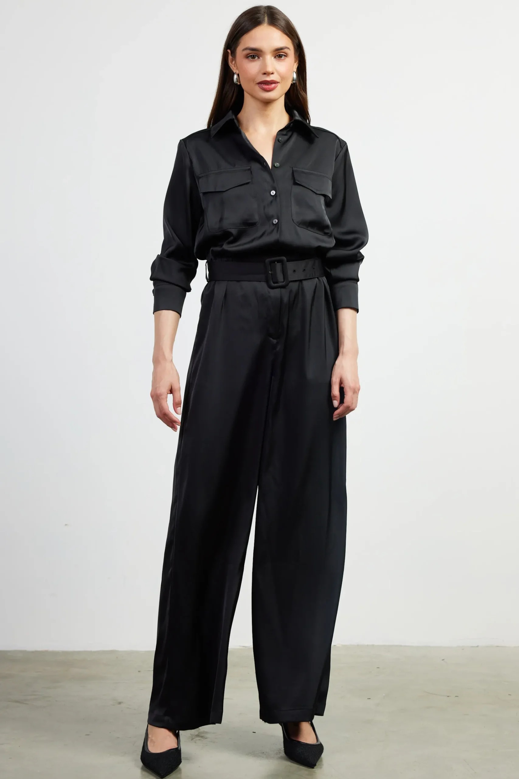 This satin jumpsuit translates the details of a classic button-up shirt onto an occasion-ready one-piece style. It’s got a pointed collar, long sleeves, and flap pockets atop loose, full-length pants. Cinch it with the matching buckle belt to create definition at the waist.