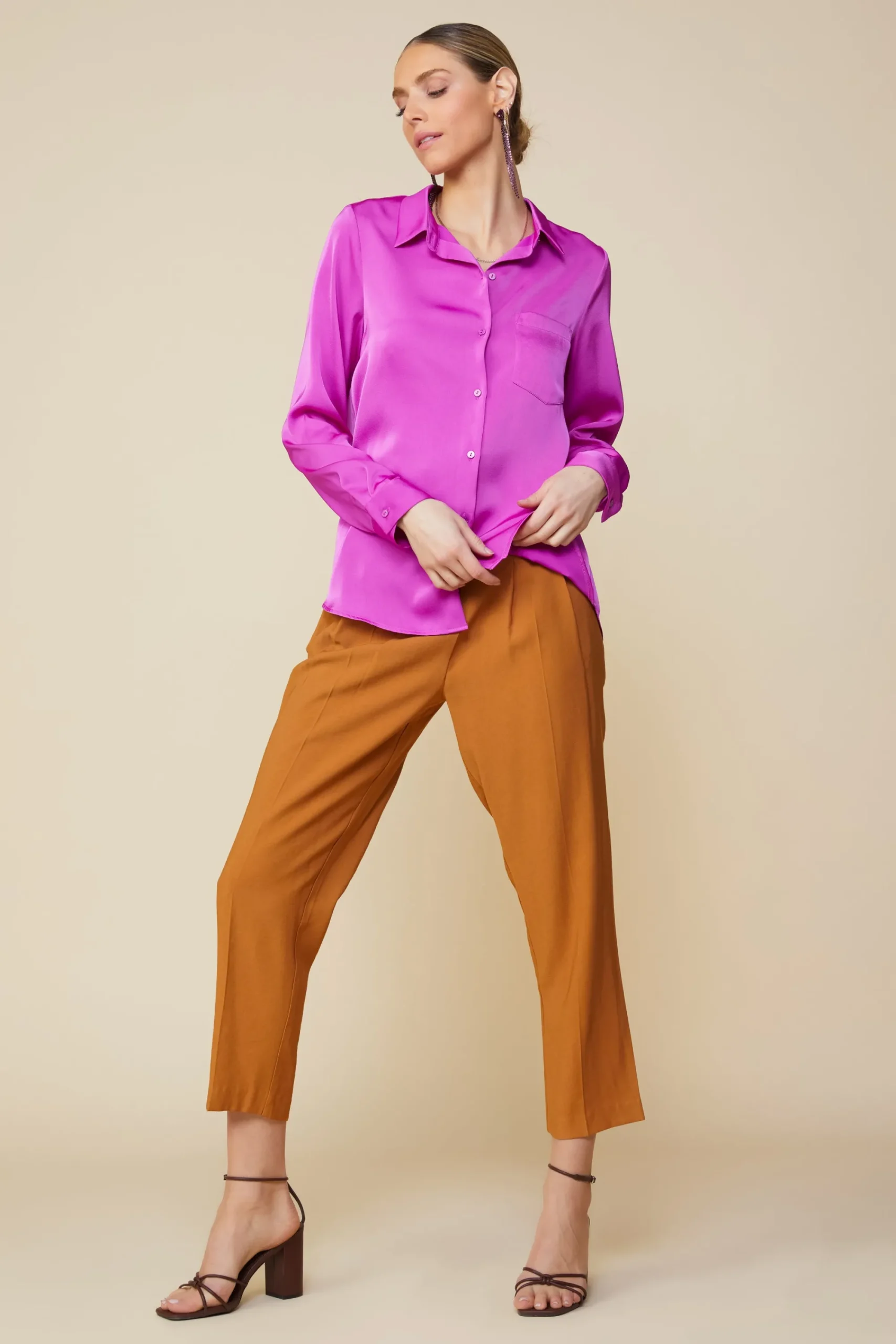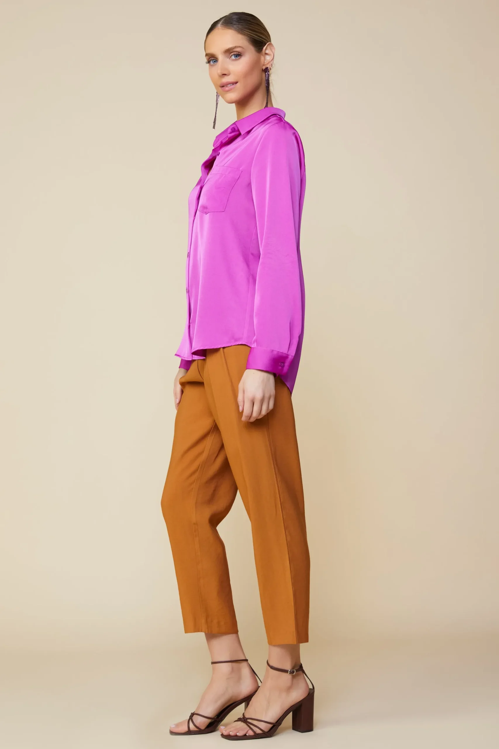 This satin buttondown shirt is one of those classics that will never steer you wrong. It’s got a pointed collar and a patch pocket, plus long sleeves with button tabs so you can roll them up and keep them in place.