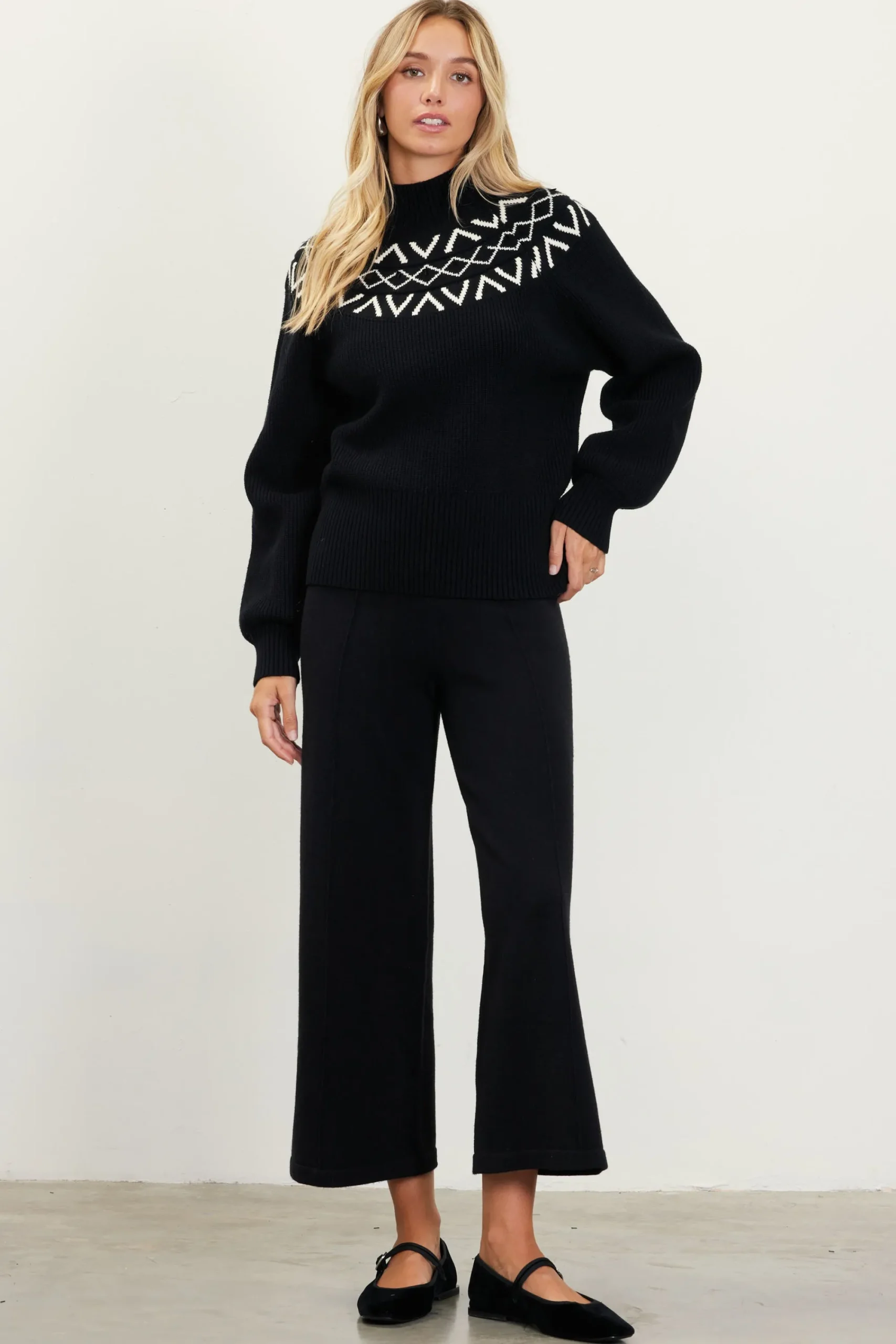 A simple, pared-back take on the fair isle sweater. Done here in black and white, it’s been knitted for a ribbed texture and accented by light-catching sequin discs.