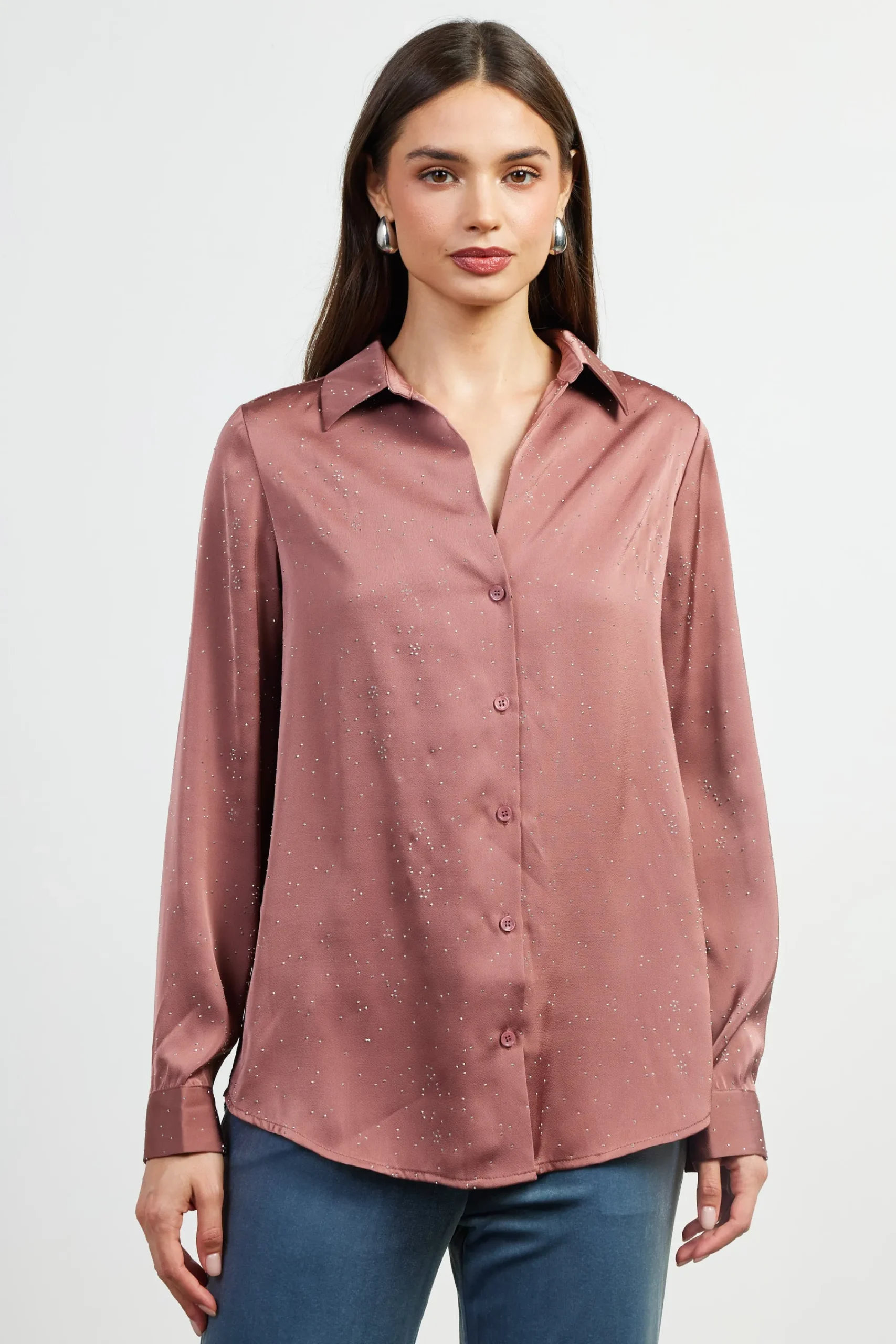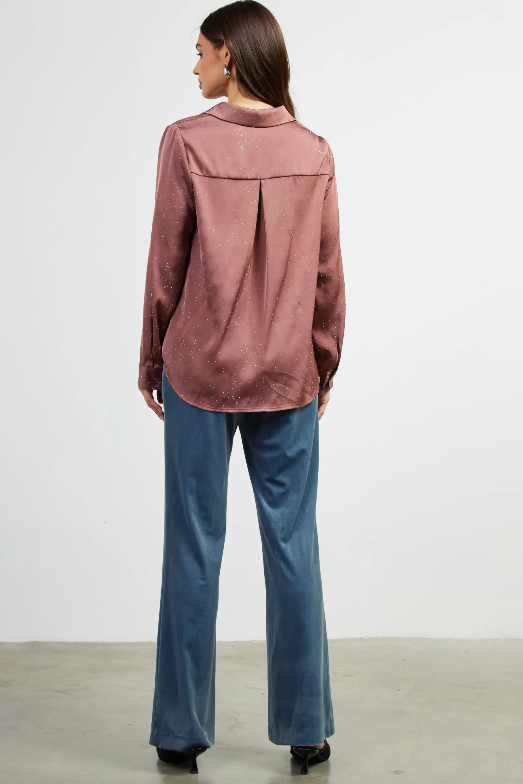 A sprinkling of shimmery, delicate stones catches the light on this satin button-up blouse. Open at the neckline, it’s got a relaxed fit that’s enhanced by a single pleat at the back.