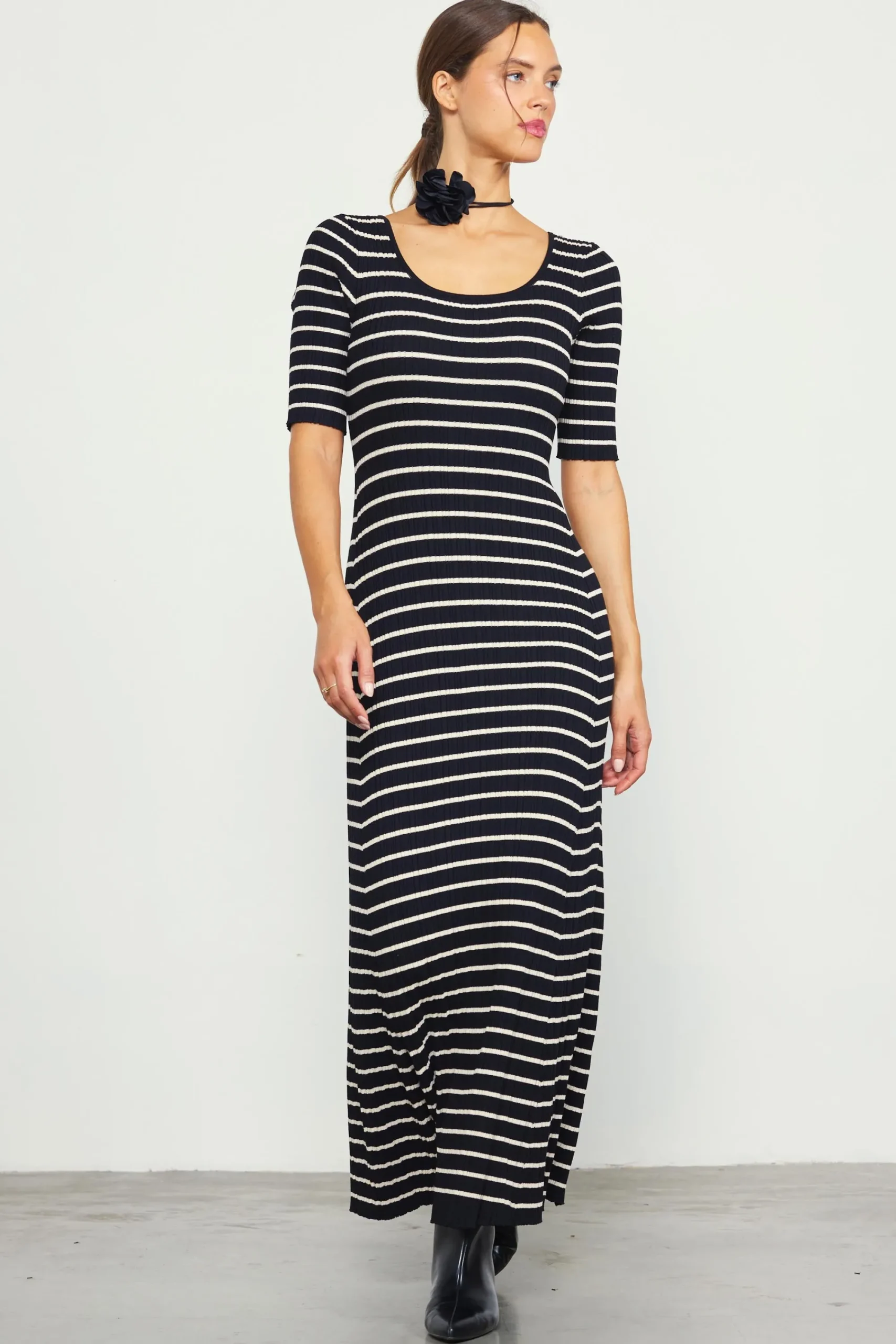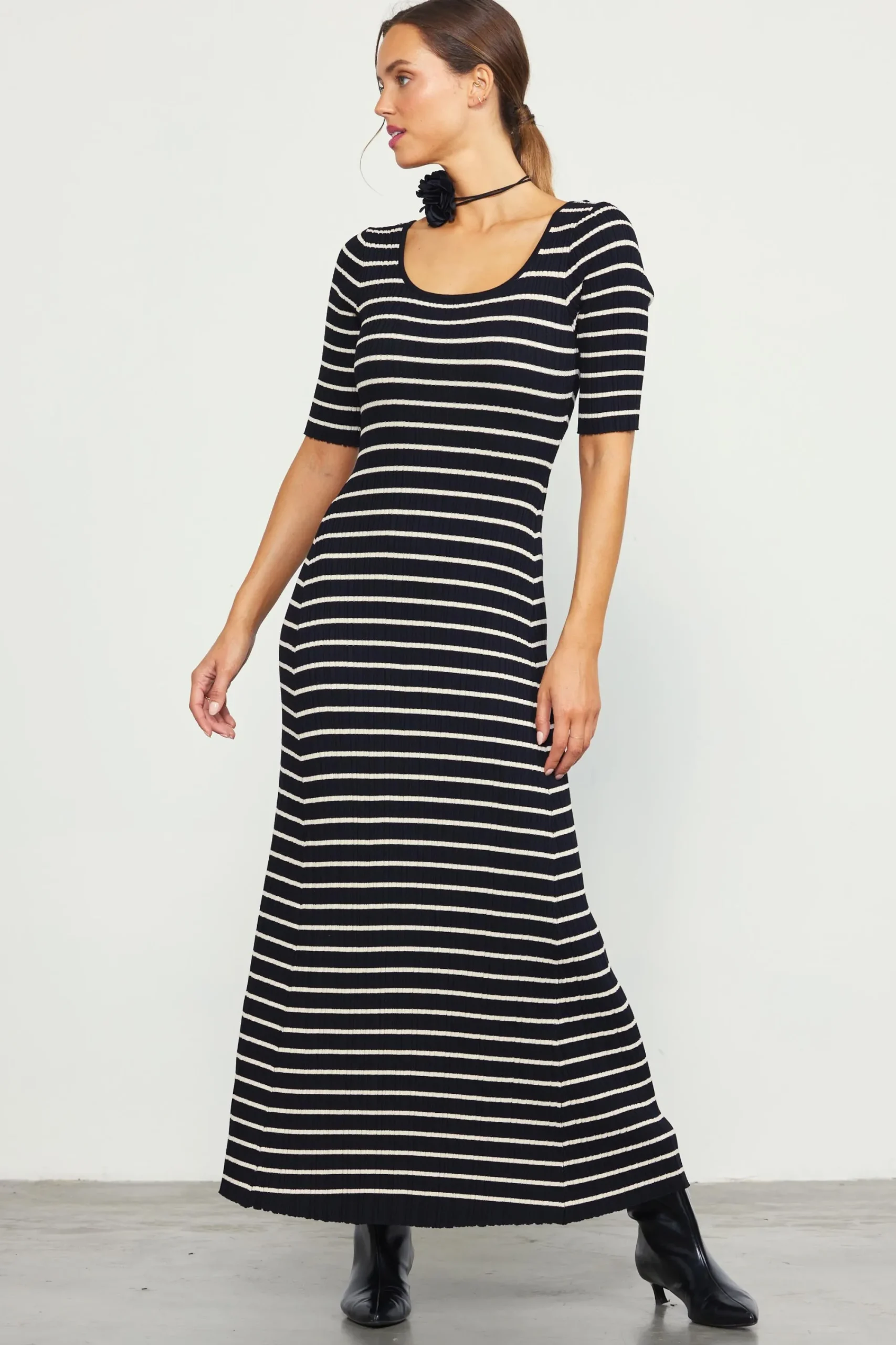 Body-skimming and sexy, but make it comfortable. This striped dress checks all the boxes. Made from a cozy rib knit, it’s cut for a long, shape-hugging silhouette with a flattering scoop neckline, short sleeves, and slight flare at the hem.