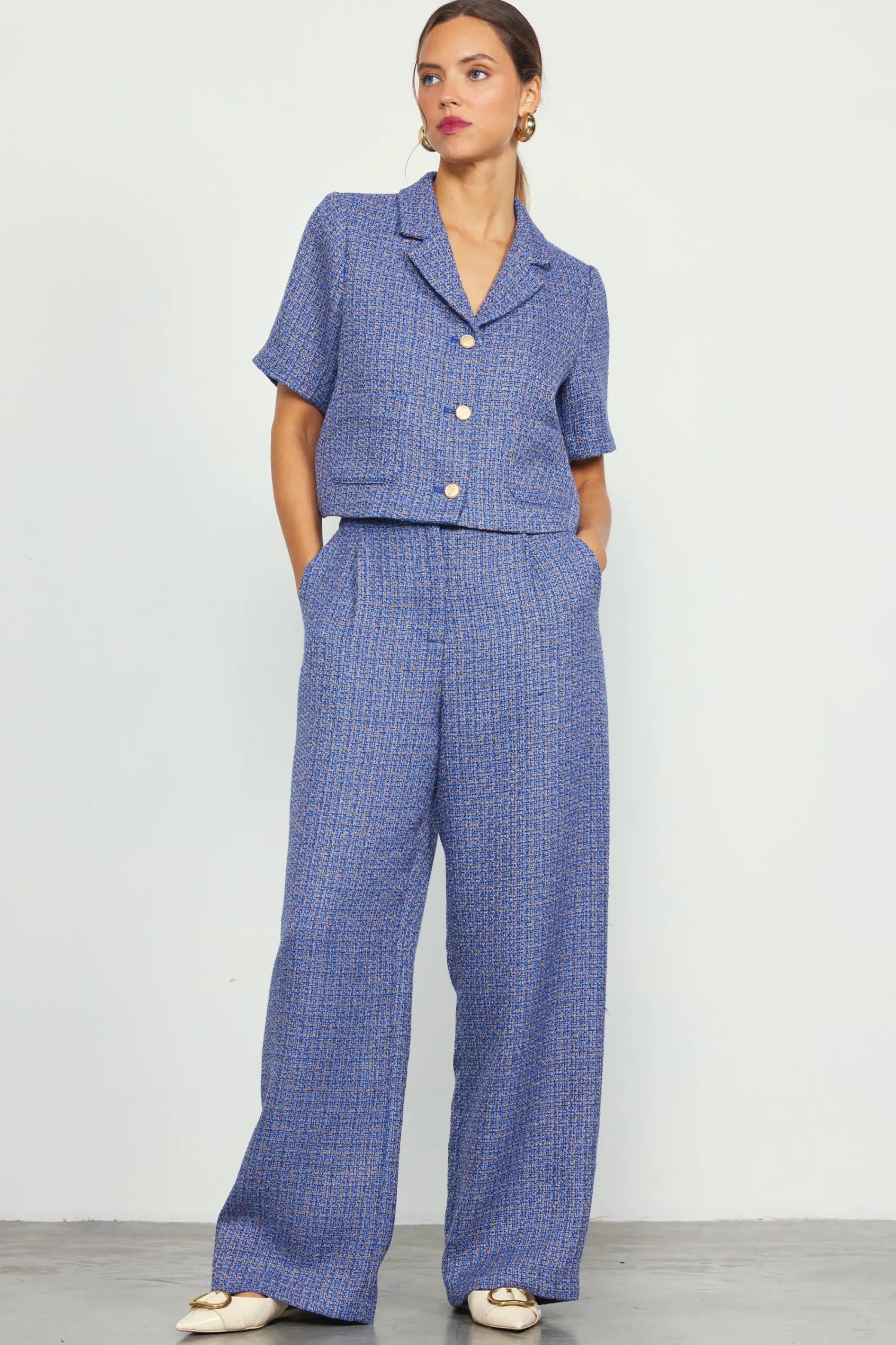 A tailored tweed jacket, updated for the warmer seasons. This cropped number is designed with notched lapels, patch pockets, and embossed buttons at the front. It wears especially well as a set with our matching tweed pants.